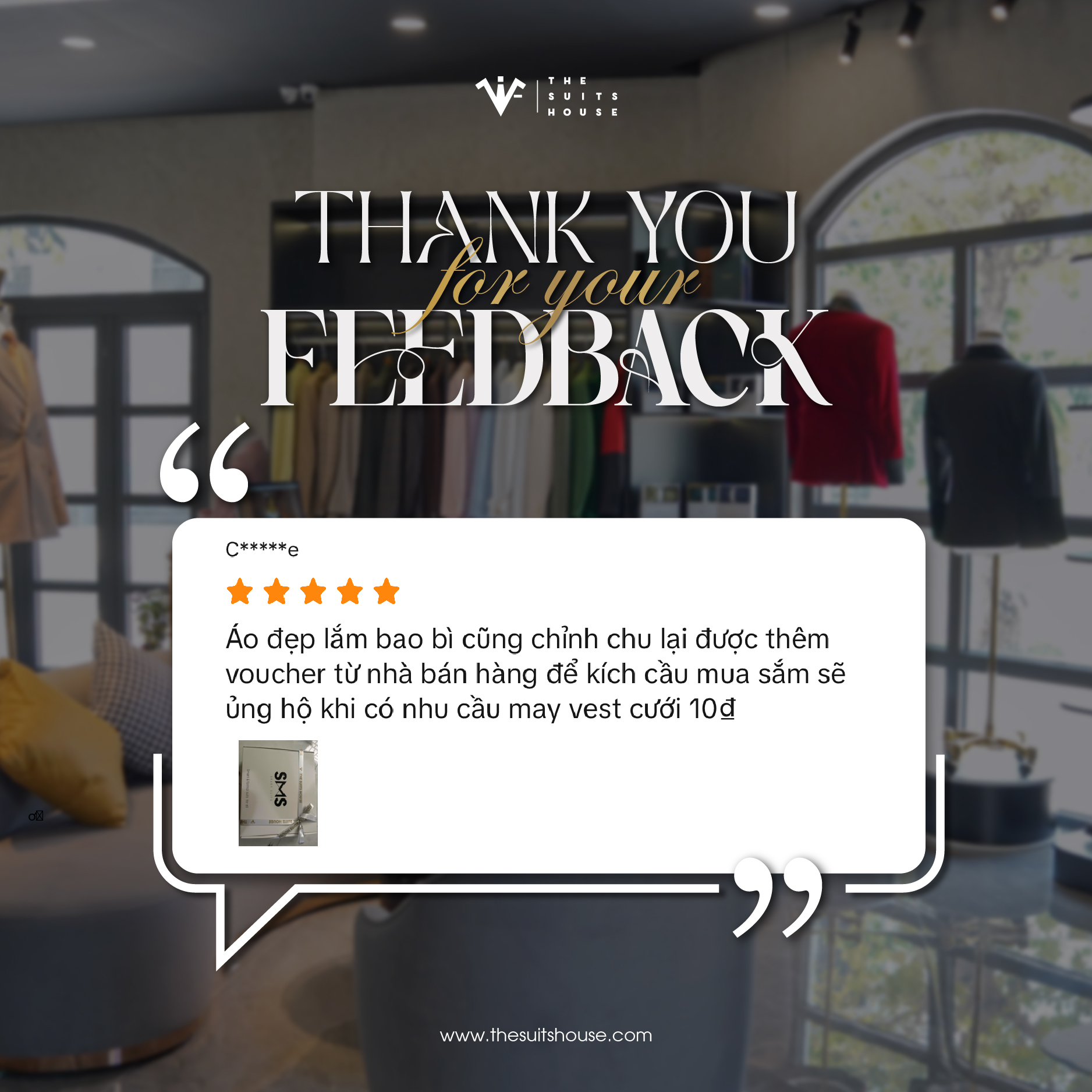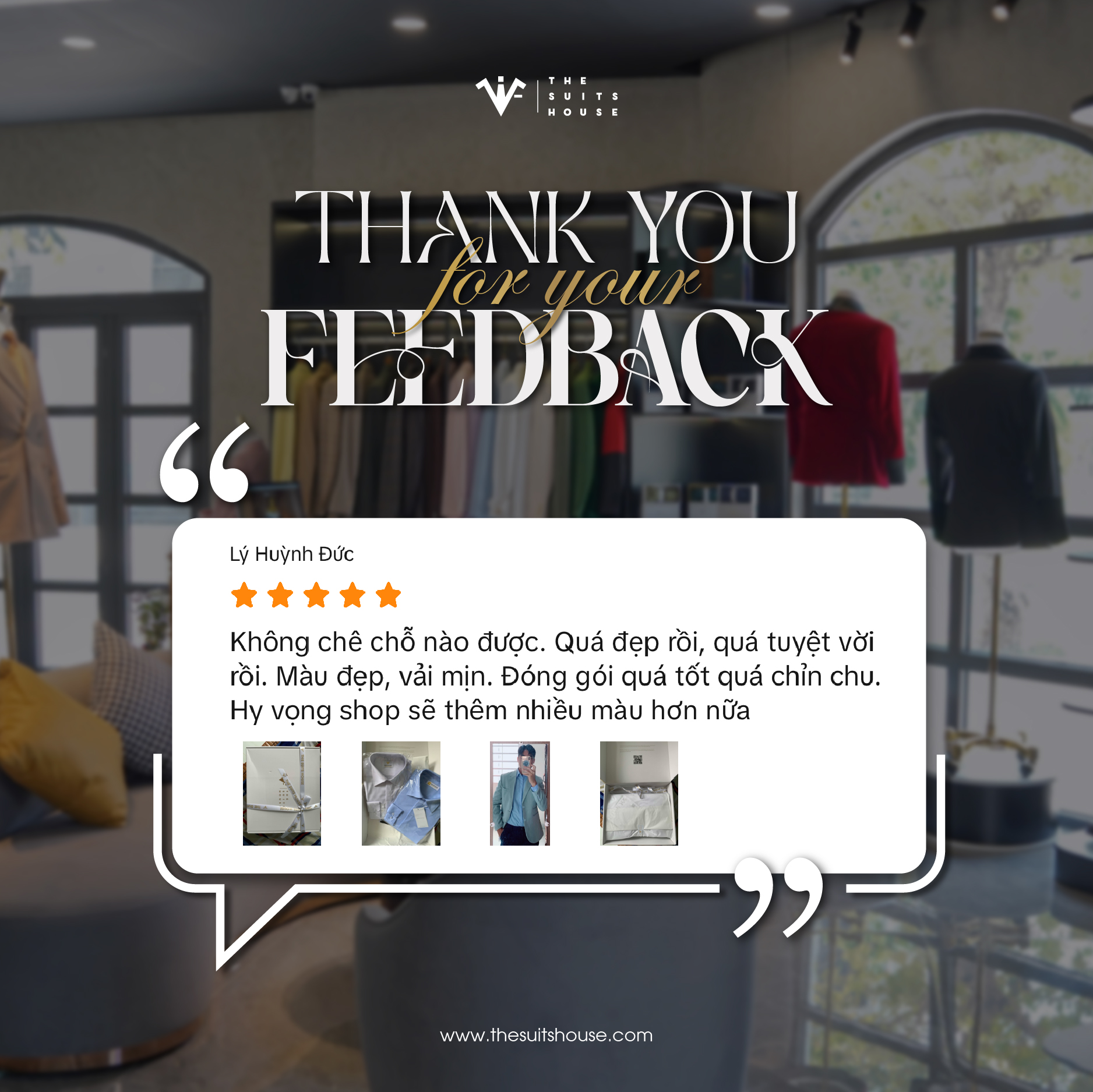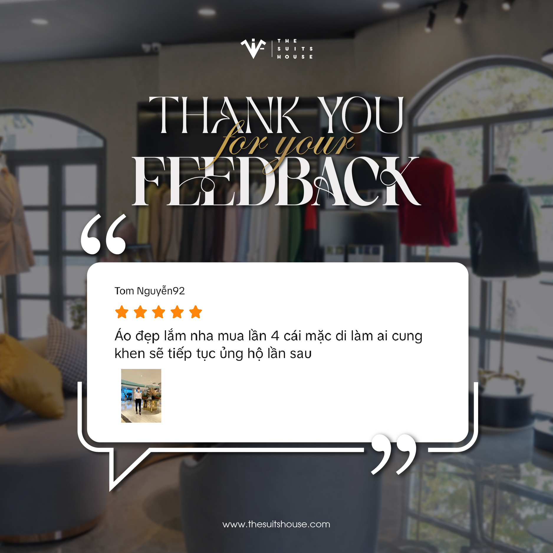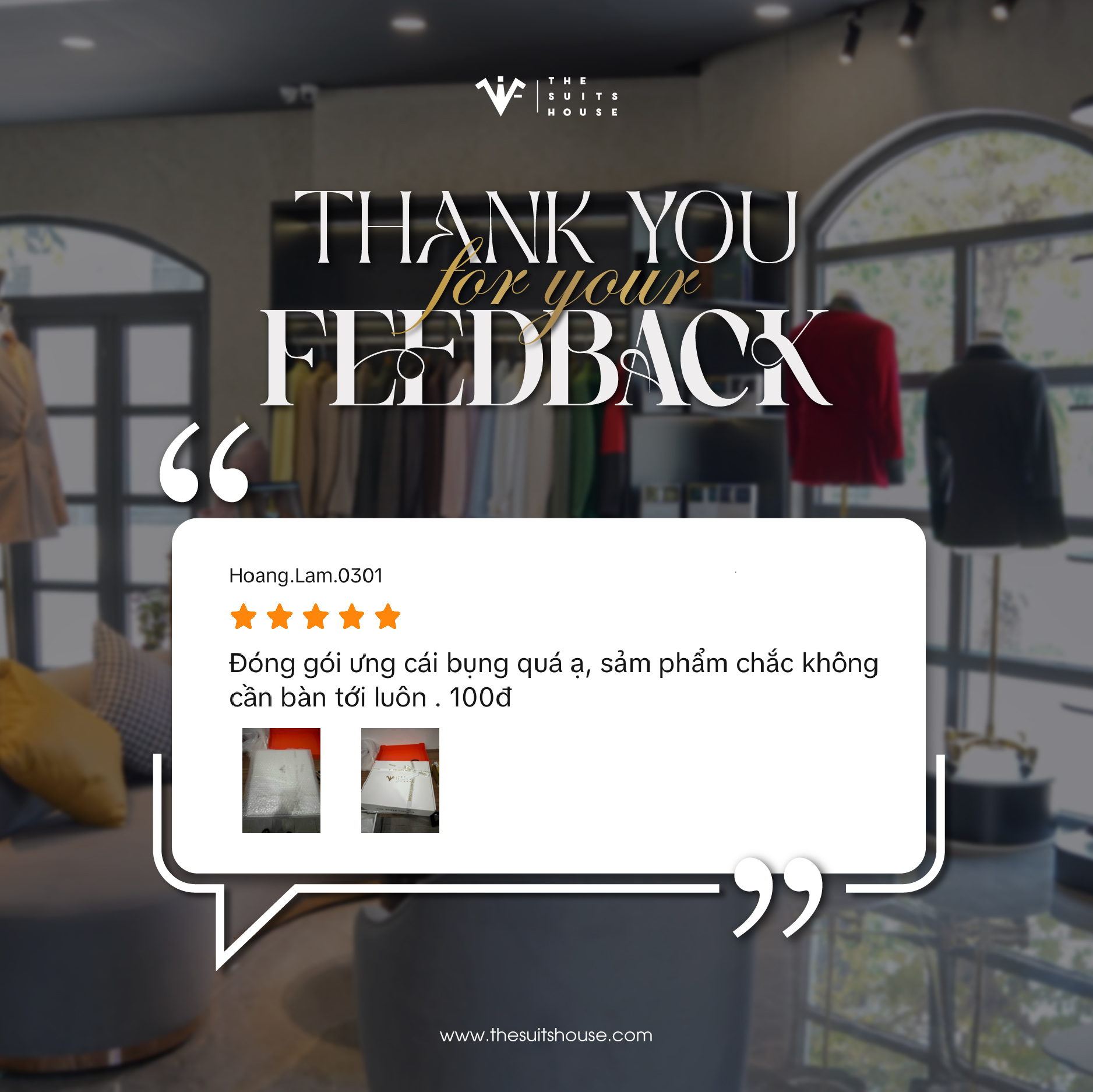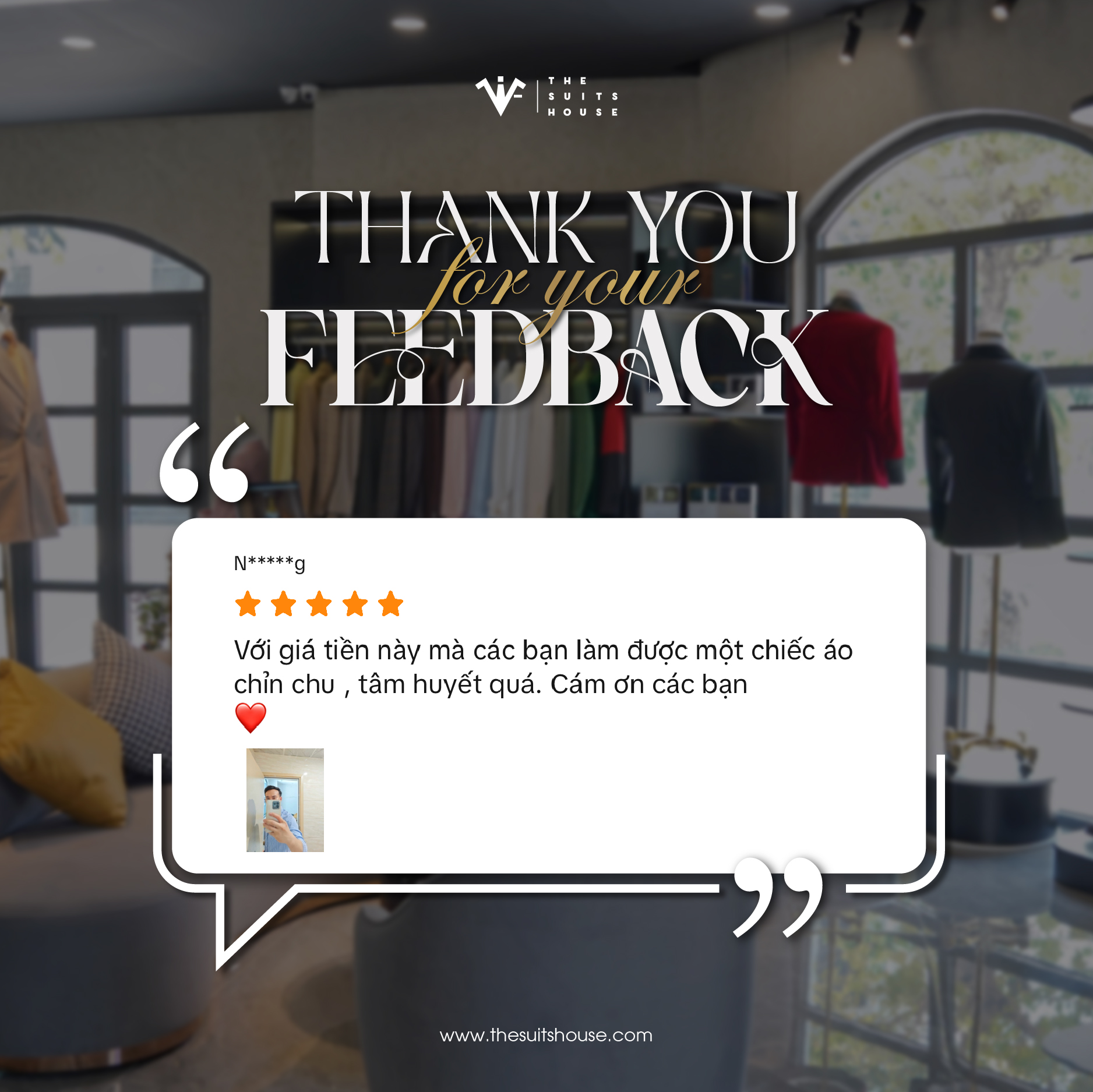Mỗi lời khen ngợi là nguồn động lực lớn lao để The Suits House không ngừng hoàn thiện. Sự tin tưởng của bạn là tài sản quý giá nhất mà chúng tôi có được. Cảm ơn bạn đã đồng hành cùng chúng tôi trên hành trình chinh phục phong cách thời trang đẳng cấp.