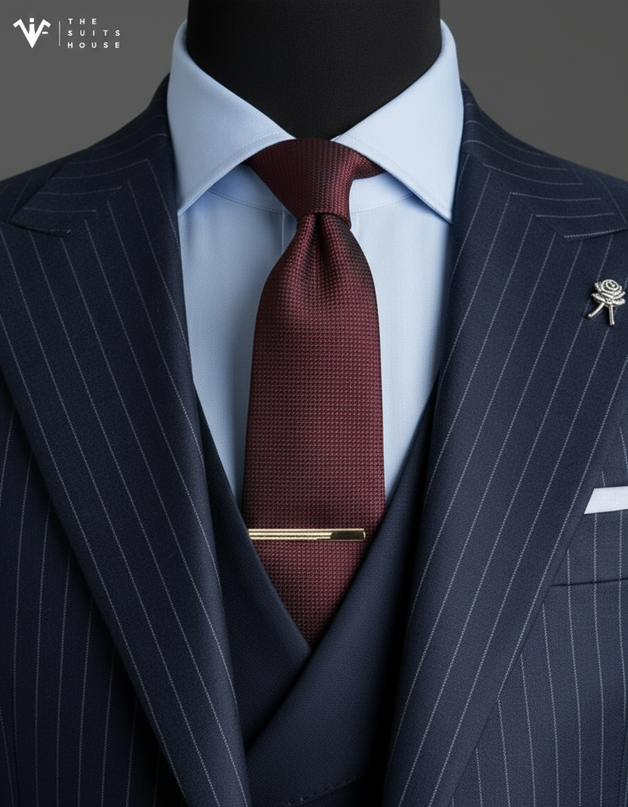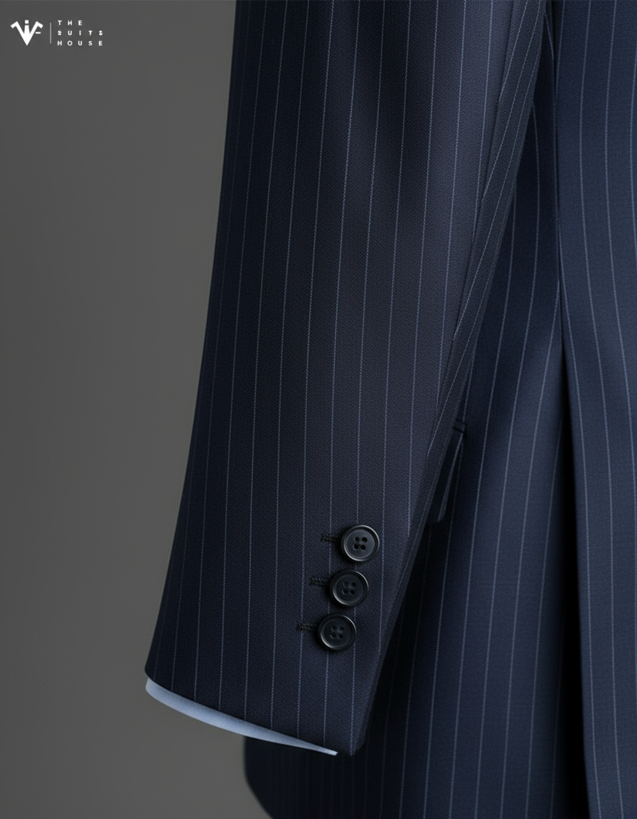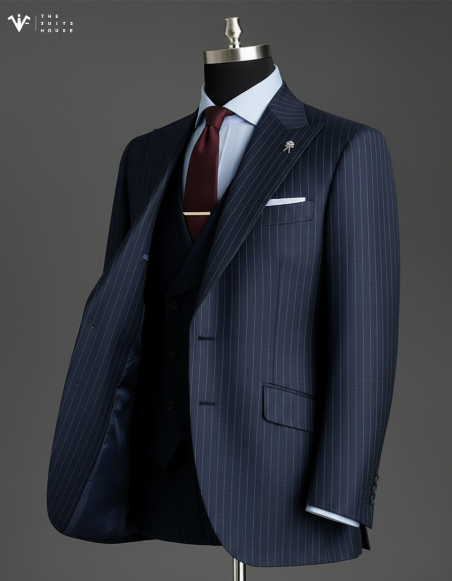 Bộ vest ba mảnh (3-piece suit) mang sắc xanh navy đậm (Dark Navy Blue) nổi bật với họa tiết sọc đứng (Pinstripe) kinh điển. Họa tiết này không chỉ mang lại vẻ ngoài uy quyền, sắc sảo mà còn giúp người mặc trông cao và thanh thoát hơn. Đây là trang phục lý tưởng cho môi trường doanh nghiệp cấp cao, đàm phán, hoặc những sự kiện yêu cầu phong thái chuyên nghiệp tuyệt đối.
