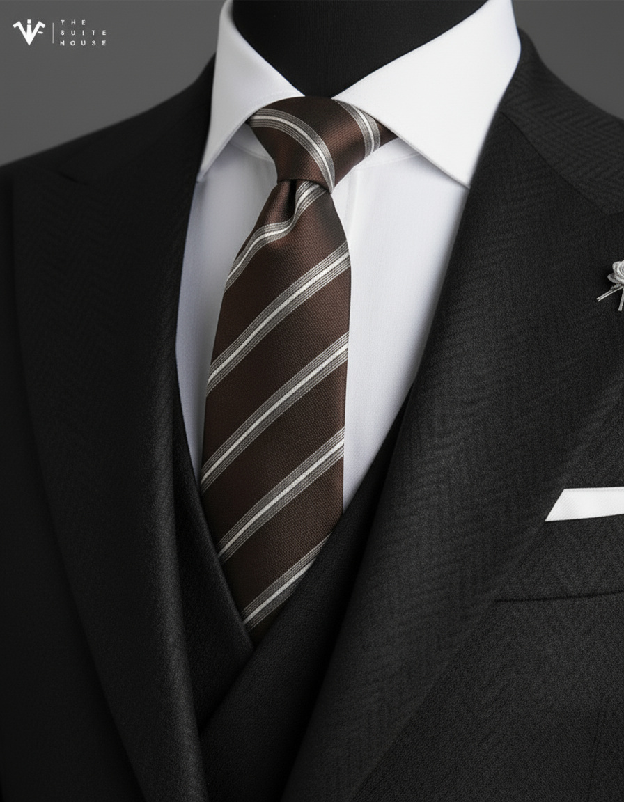Khi phối cùng sơ mi trắng và cà vạt sọc nâu, tổng thể trở nên đĩnh đạc, lịch lãm và đầy chiều sâu, thể hiện gu thẩm mỹ tinh tế của quý ông The Suits House – người luôn biết mình muốn gì và biết cách xuất hiện ấn tượng nhất.