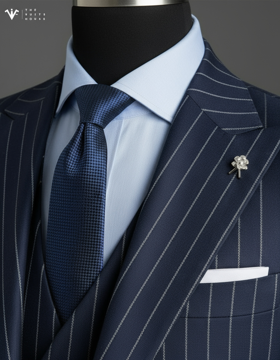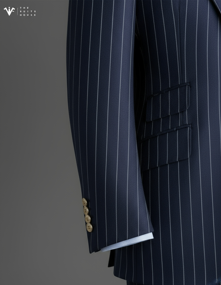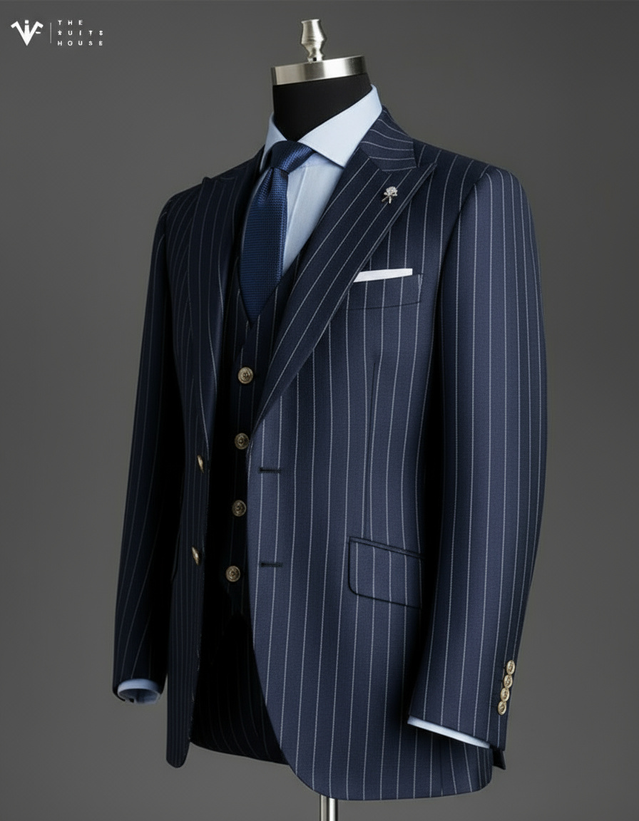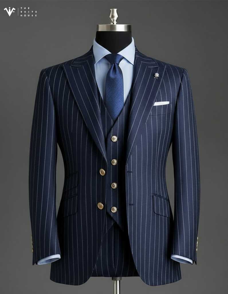 Bộ vest ba mảnh (3-piece suit) mang sắc Xanh Navy Sâu (Deep Navy) nổi bật với họa tiết sọc phấn (Chalk Stripe). Điểm đặc biệt của bộ vest này là các đường sọc dày và rõ ràng, kết hợp với chi tiết khuy áo màu đồng/vàng kim (brass/gold buttons), tạo nên vẻ ngoài uy quyền, táo bạo và đẳng cấp của một vị lãnh đạo.