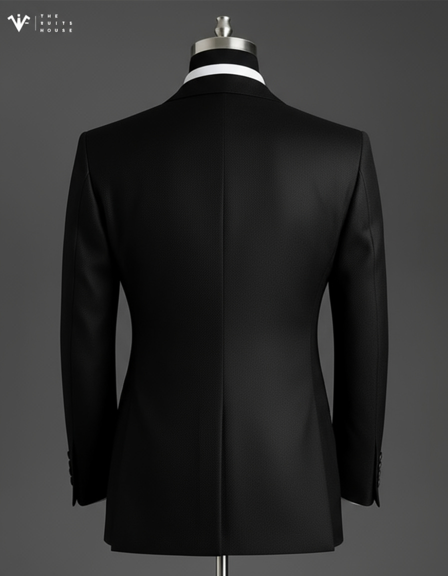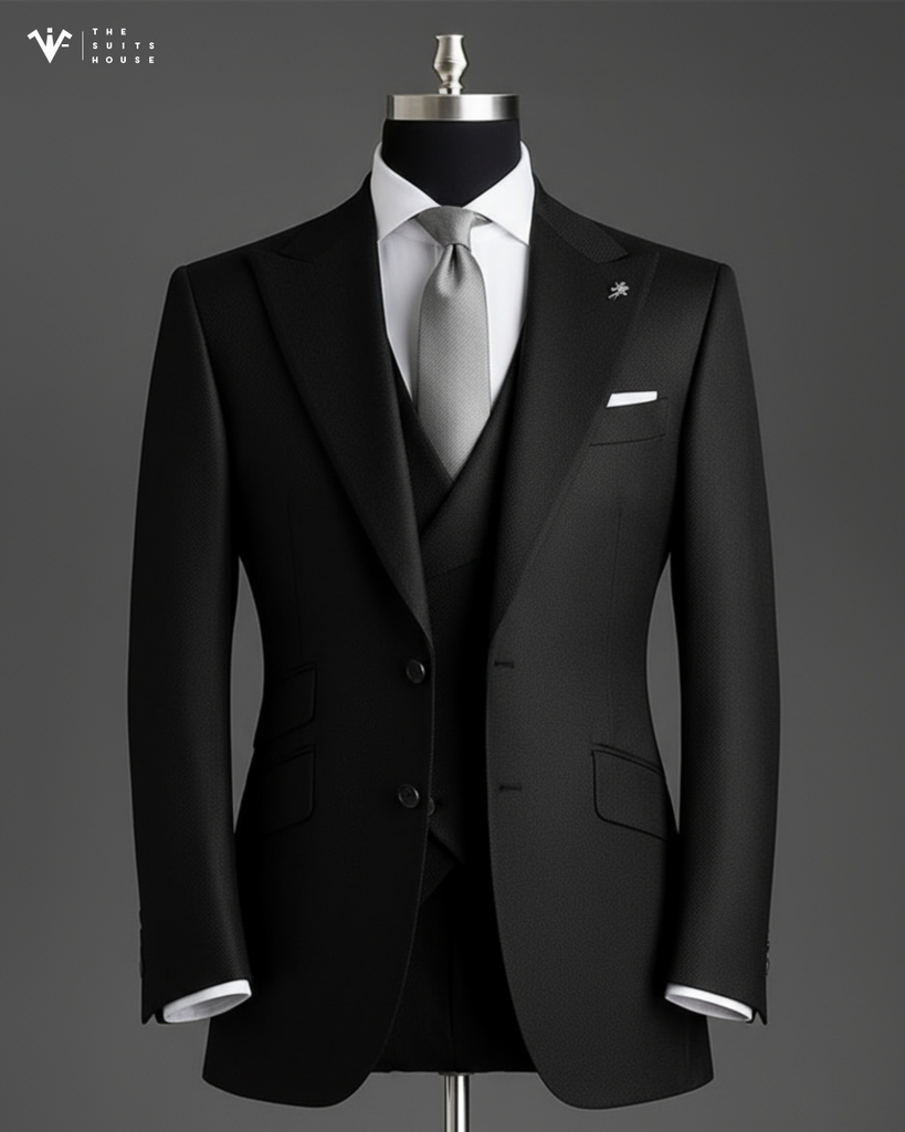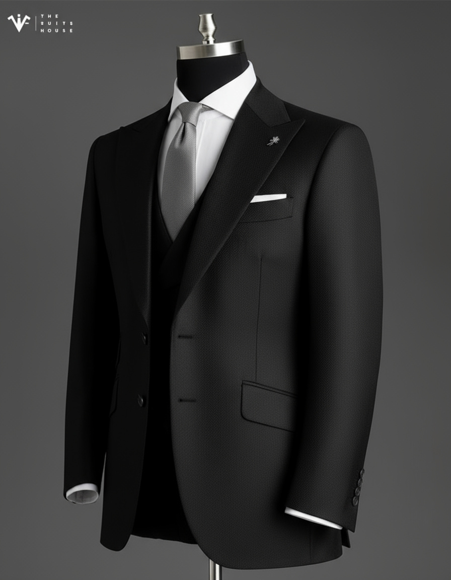 Một thiết kế biểu trưng cho đẳng cấp của người đàn ông dẫn đầu. Bộ three-piece suit màu đen tuyền sang trọng, được may trên nền vải wool cao cấp pha silk, mang đến cảm giác mượt nhẹ, giữ phom hoàn hảo và tôn dáng ở mọi góc nhìn.