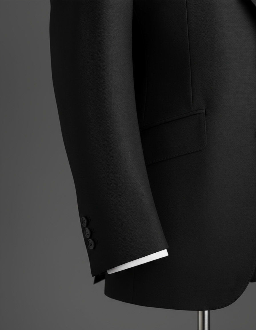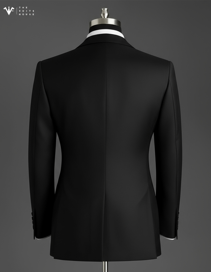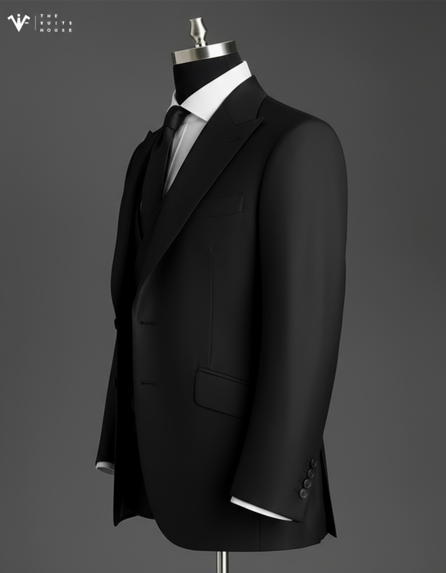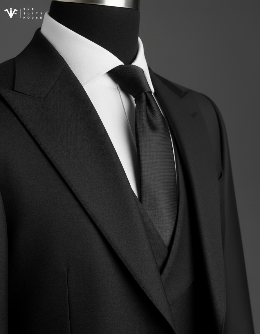 Chi tiết ve áo peak lapel rộng bản, đường may sắc gọn thủ công, cùng thiết kế tối giản không thừa chi tiết chính là cách The Suits House tôn vinh tinh thần “đo ni phong thái – định hình bản lĩnh”.