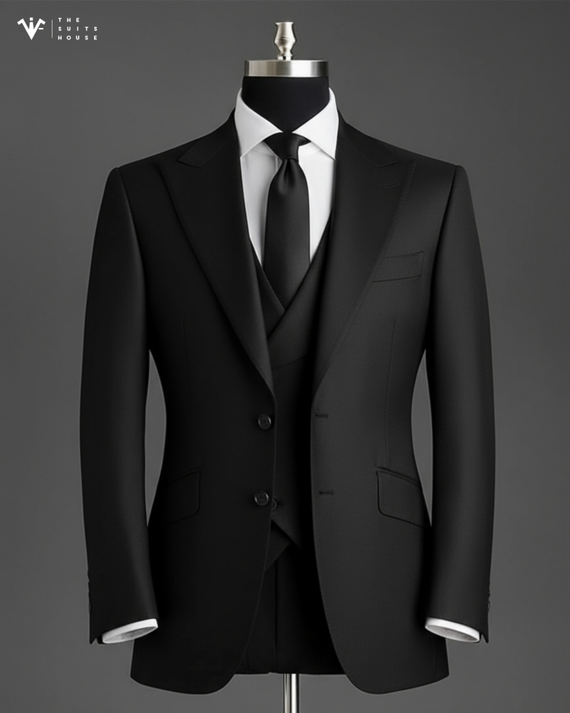 Bộ three-piece suit được cắt may chuẩn phom classic slim-fit, sử dụng chất liệu wool cao cấp pha silk, giúp bề mặt vải có độ lì nhẹ, mềm mại và đứng dáng hoàn hảo. Tông đen tuyền tuyệt đối kết hợp cùng cravat đồng màu mang lại vẻ ngoài liền mạch, mạnh mẽ và đầy khí chất.