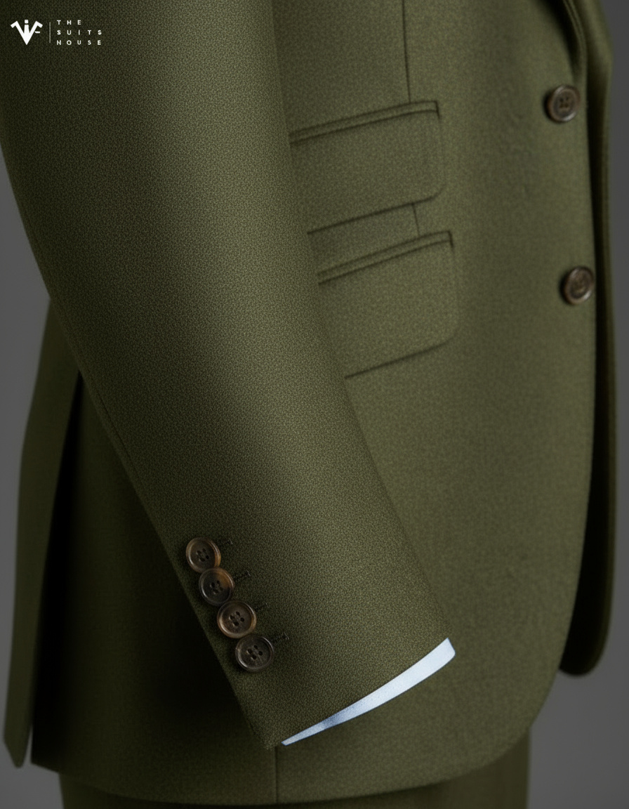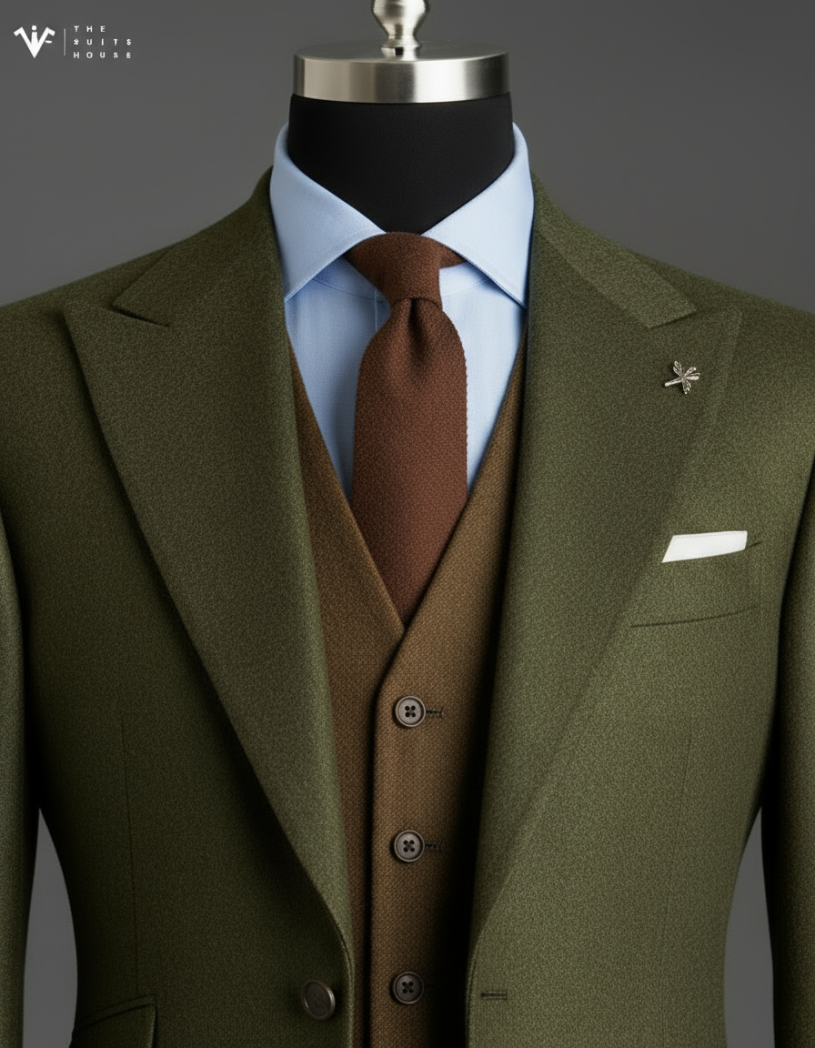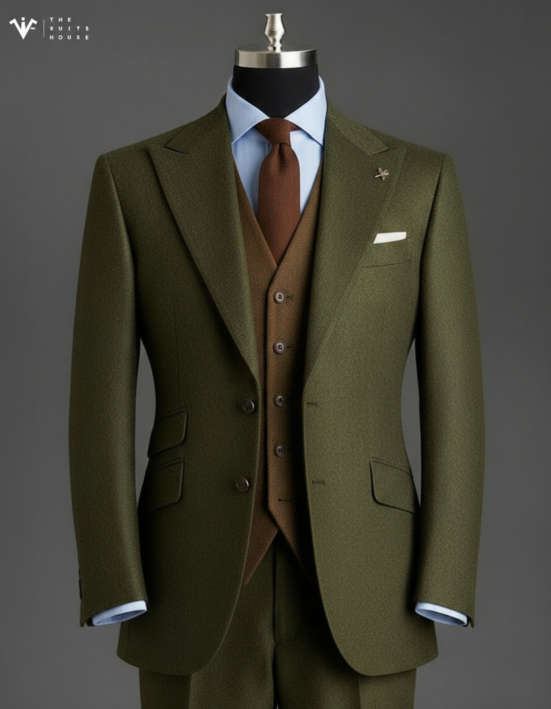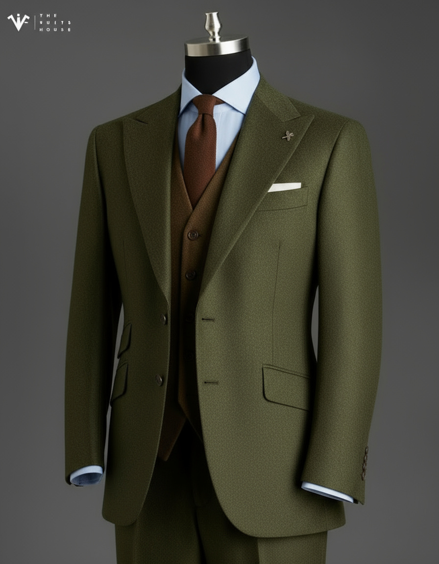 Bộ vest ba mảnh (3-piece suit) mang sắc xanh rêu trầm (Olive Green/Moss Green) – một tông màu đậm chất cổ điển (vintage), sang trọng và khác biệt. Bộ trang phục này gợi lên vẻ ngoài của quý ông Anh Quốc lịch thiệp, rất phù hợp cho các sự kiện ngoài trời, tiệc cưới phong cách rustic, hoặc trang phục công sở cao cấp.