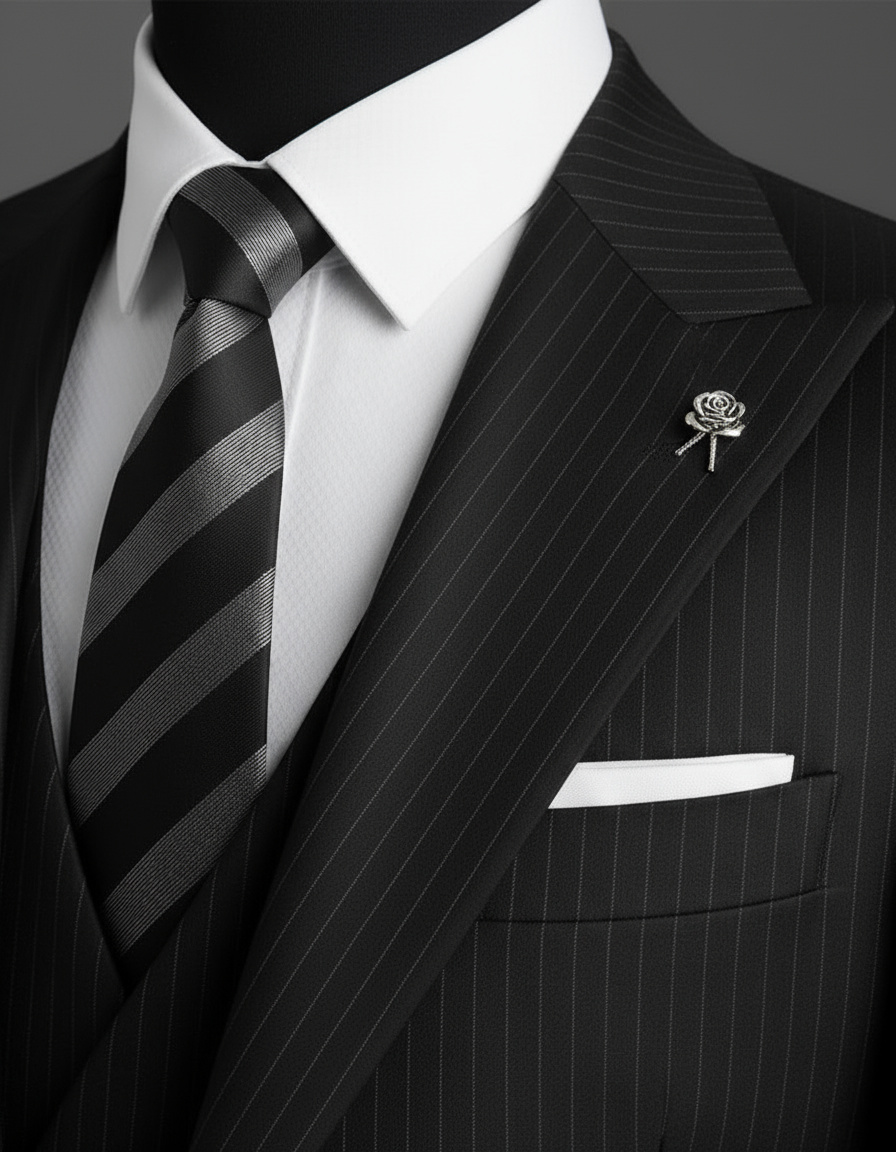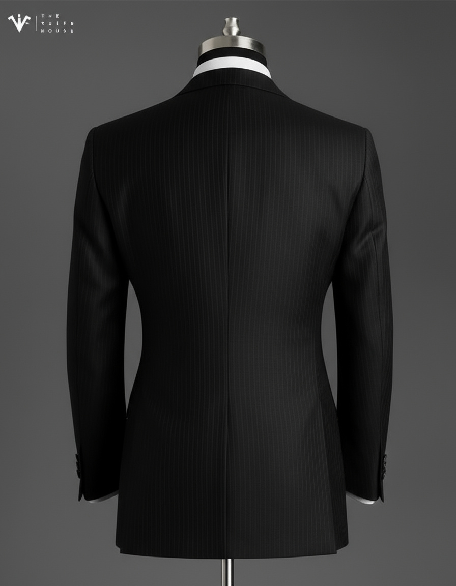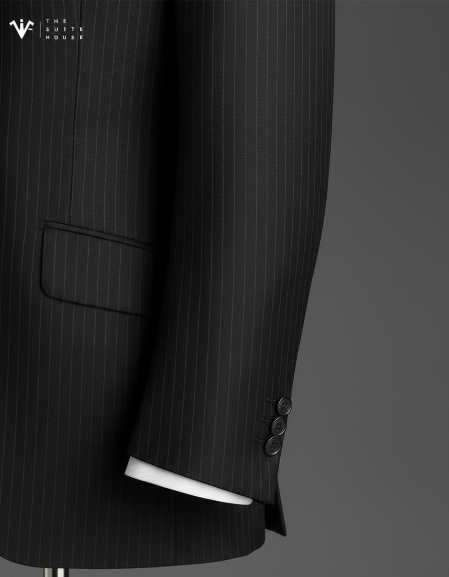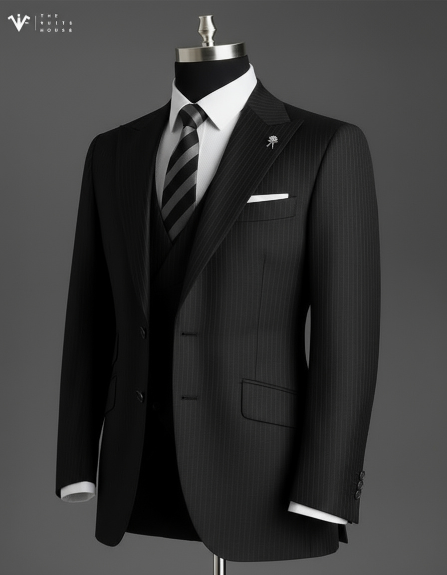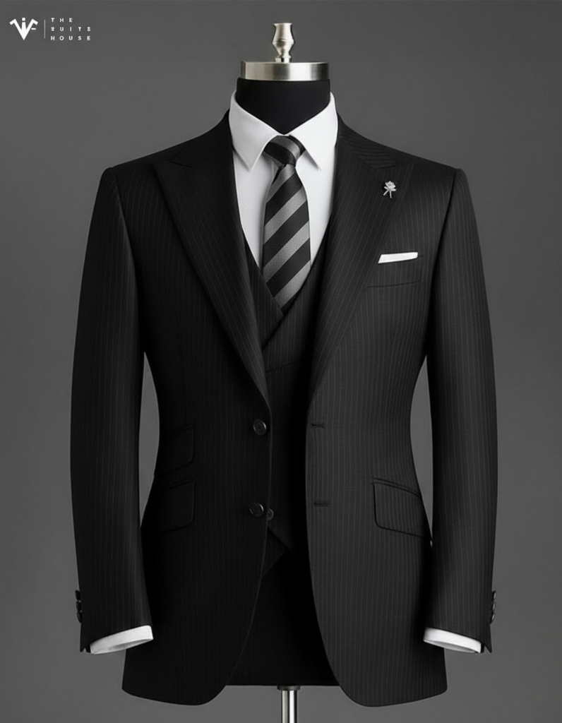 Một thiết kế mang tinh thần quý ông hiện đại, nơi đường kẻ pinstripe thanh mảnh được xử lý tinh tế trên nền đen than sang trọng, tạo nên tổng thể đầy chiều sâu và đĩnh đạc.