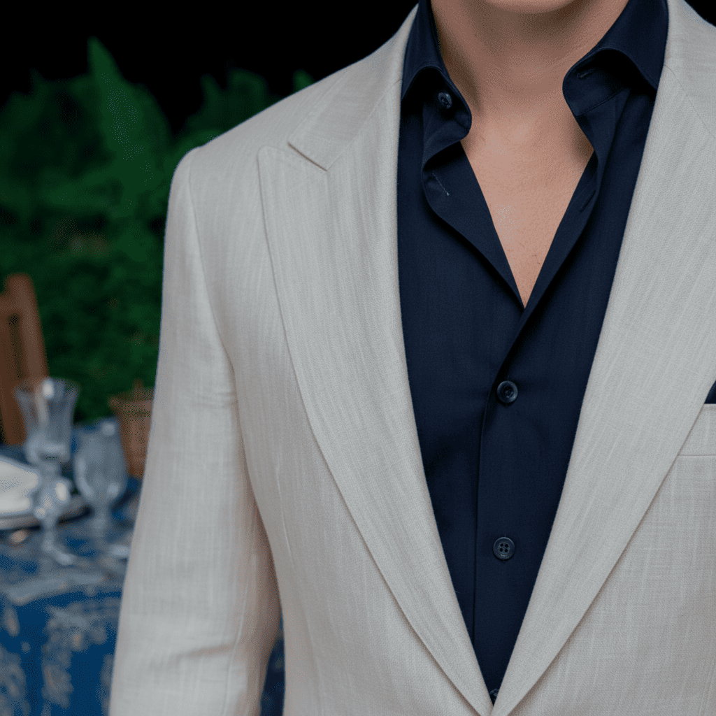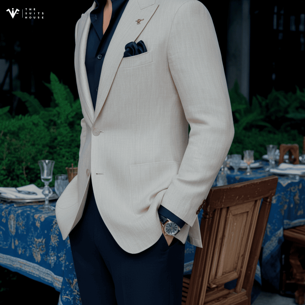 Chất liệu linen cao cấp tông kem sáng giúp bộ suit mang vẻ thanh thoát và tự nhiên, kết hợp cùng áo sơ mi navy tạo nên một tổng thể tương phản đầy cuốn hút – vừa lịch sự trong không gian trang trọng, vừa phóng khoáng giữa những buổi tiệc tinh tế.