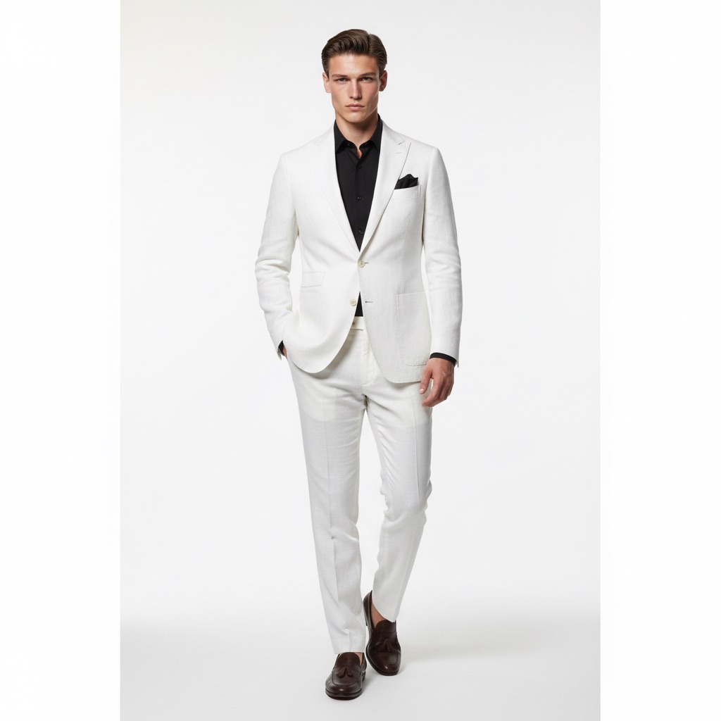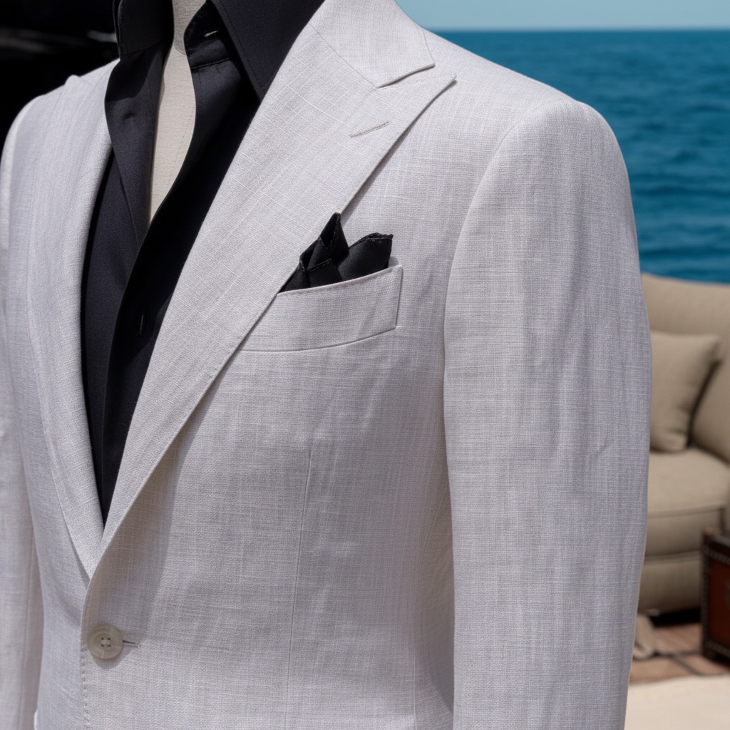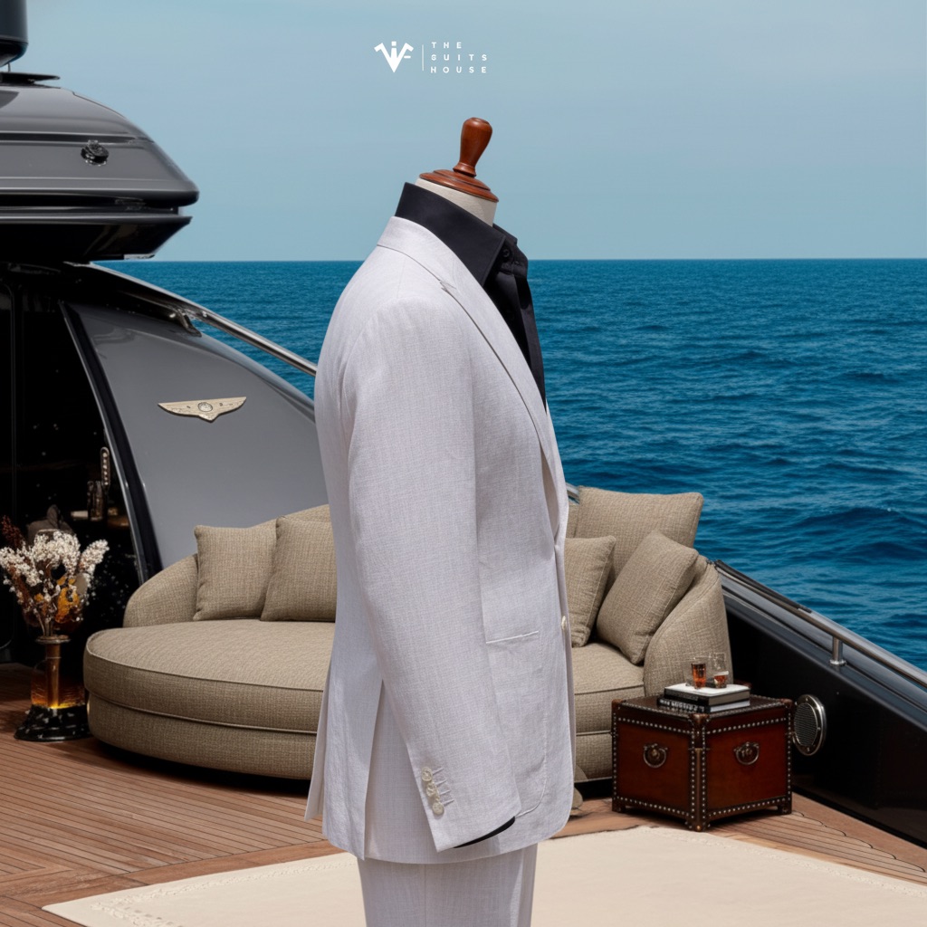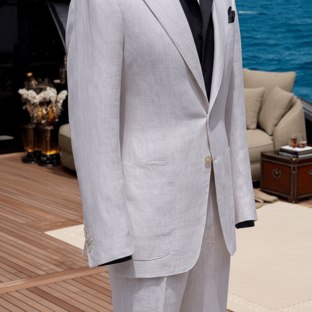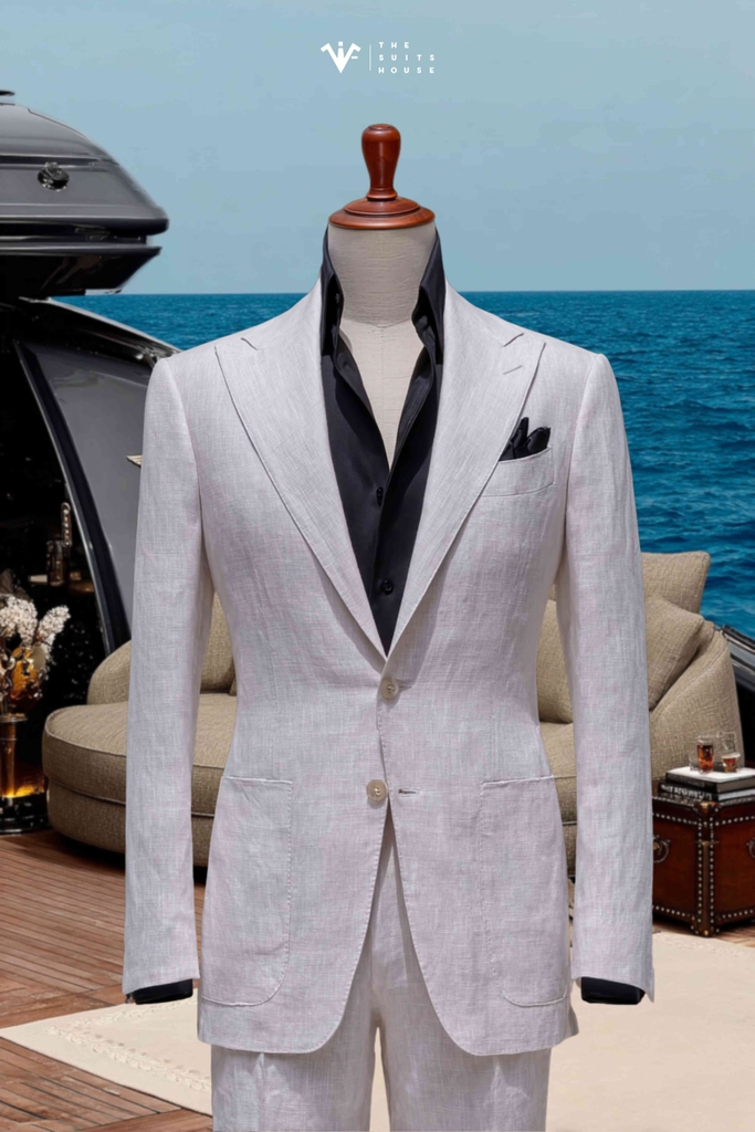 Bộ vest linen xám nhạt từ thương hiệu Giovanni Sartori là biểu tượng của phong cách quý ông hiện đại. Với chất liệu linen cao cấp, thiết kế này mang đến cảm giác thoáng mát nhưng vẫn giữ được sự chỉn chu và tinh tế. Áo vest được may đo tỉ mỉ với ve áo kiểu notch, kết hợp cùng áo sơ mi đen tạo nên sự tương phản đầy cuốn hút. Chi tiết khăn túi ngực là điểm nhấn hoàn hảo, thể hiện sự tinh tế trong từng chi tiết.