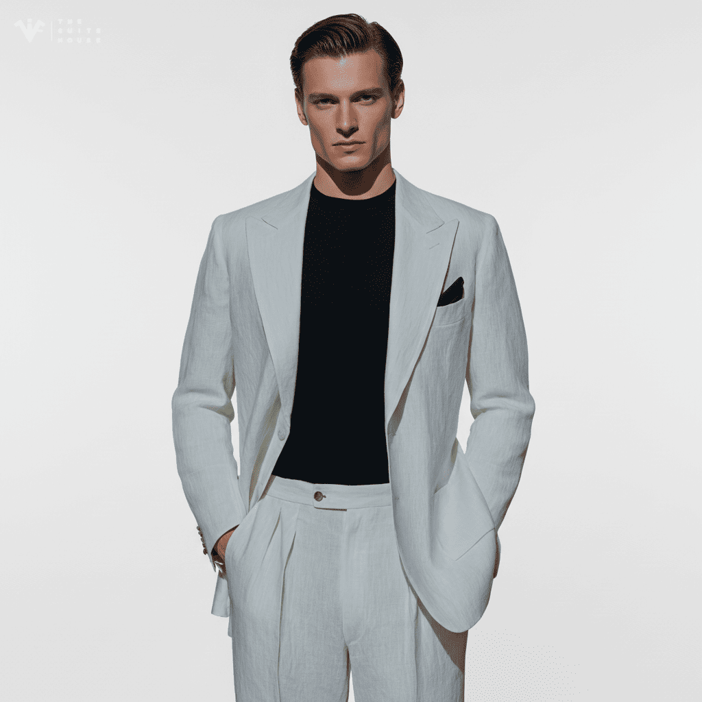Với chất liệu Linen (vải lanh) thượng hạng, bộ suit này mang tông màu Trắng Ngà (Ivory) thanh lịch, tạo nên vẻ ngoài tươi mới và sang trọng dưới ánh nắng. Ve áo Peak Lapel bản rộng được cắt may sắc sảo, tôn lên sự mạnh mẽ và uy quyền của người mặc, cân bằng hoàn hảo với tính casual của chất liệu. Thiết kế hai mảnh gọn gàng, được phối cùng áo thun đen bên trong, nhấn mạnh sự phóng khoáng và tinh tế tuyệt đối.
