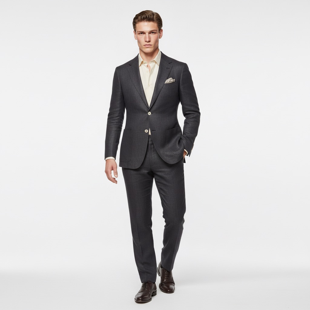 Đường kẻ pinstripe tinh tế giúp tôn dáng và tạo chiều sâu thị giác, trong khi gam xám than trầm ấm khẳng định sự trưởng thành và bản lĩnh. Khi kết hợp cùng sơ mi màu kem và khăn túi pocket square điểm nhấn, tổng thể trở nên thanh lịch, phong nhã và đầy sức hút.