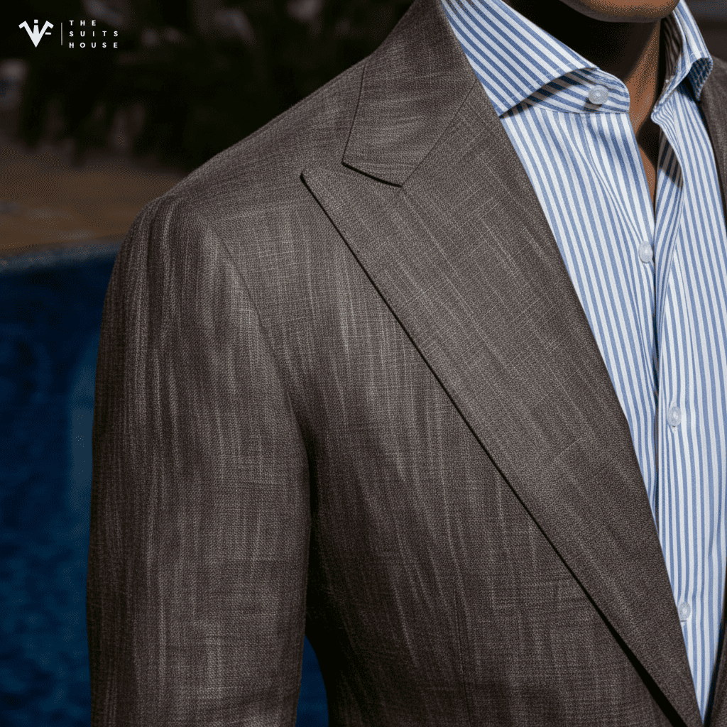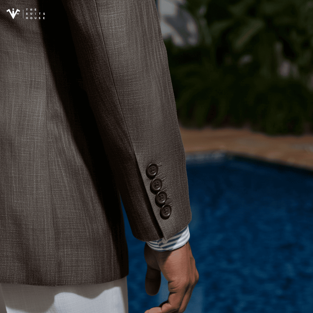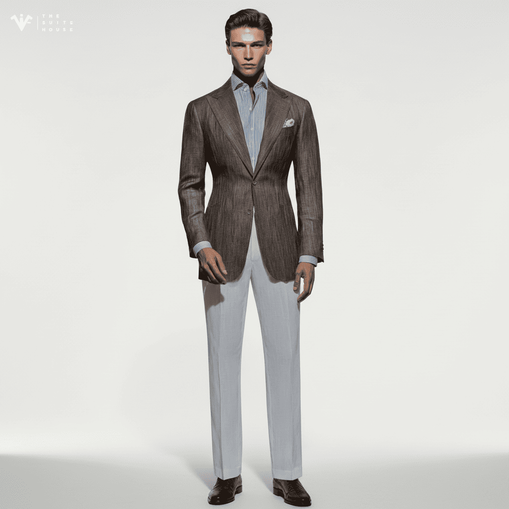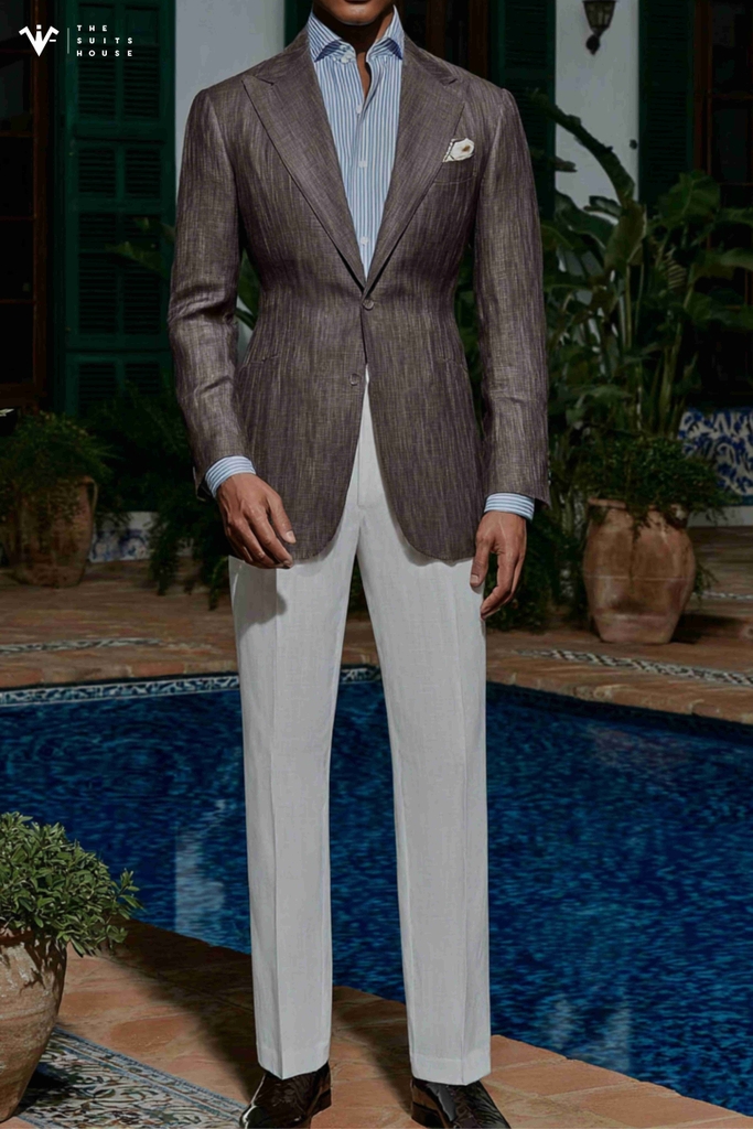 Với chất liệu Linen (vải lanh) thượng hạng, chiếc blazer này mang tông màu Cát/Be trung tính quý phái, tạo nên vẻ ngoài thư thái và sang trọng dưới ánh nắng. Ve áo Notch Lapel bản rộng được cắt may sắc sảo, cùng thiết kế túi đắp ngoài (Patch Pockets), cân bằng hoàn hảo giữa sự đứng đắn của trang phục may đo và phong cách phóng khoáng của mùa hè. Chi tiết một nút cài đơn giản và sự phối hợp cùng áo sơ mi trắng mở cổ nhấn mạnh gu thẩm mỹ sành điệu không cần gắng gượng.