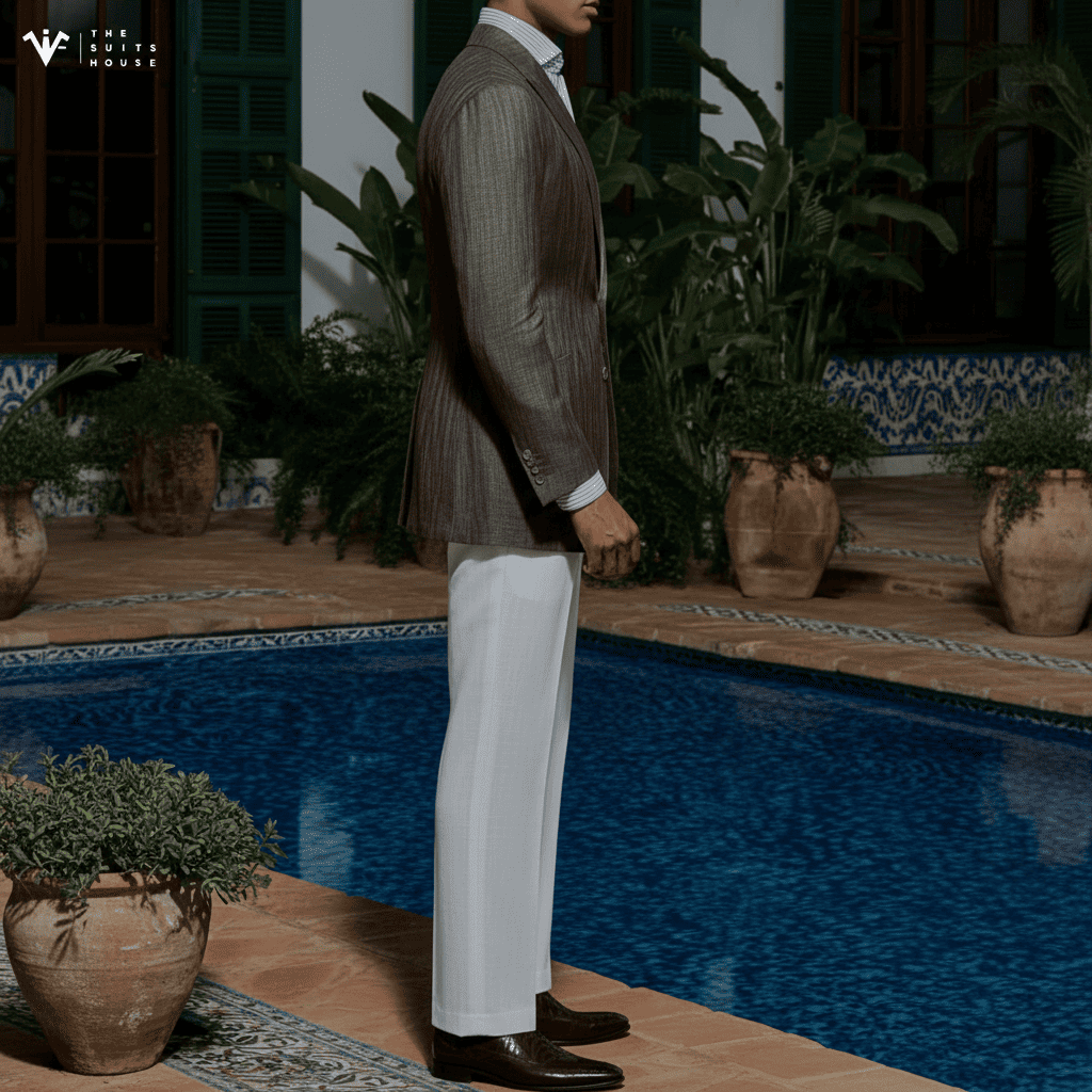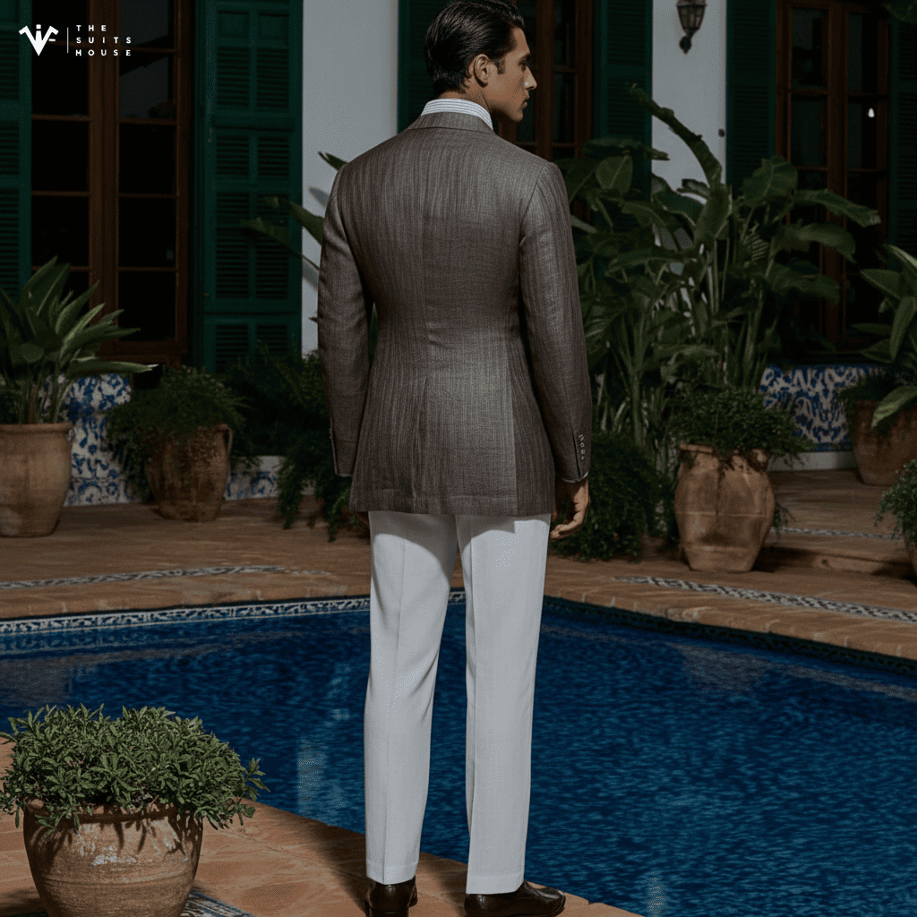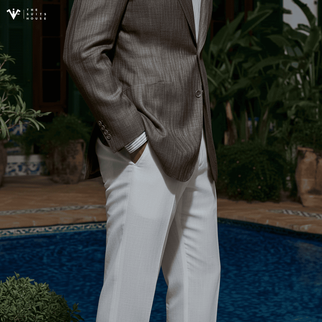 Với chất liệu Linen (vải lanh) thượng hạng, chiếc blazer này mang tông màu Cát/Be trung tính quý phái, tạo nên vẻ ngoài thư thái và sang trọng dưới ánh nắng. Ve áo Notch Lapel bản rộng được cắt may sắc sảo, cùng thiết kế túi đắp ngoài (Patch Pockets), cân bằng hoàn hảo giữa sự đứng đắn của trang phục may đo và phong cách phóng khoáng của mùa hè. Chi tiết một nút cài đơn giản và sự phối hợp cùng áo sơ mi trắng mở cổ nhấn mạnh gu thẩm mỹ sành điệu không cần gắng gượng.