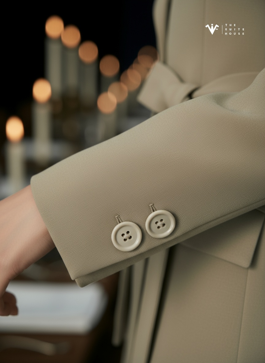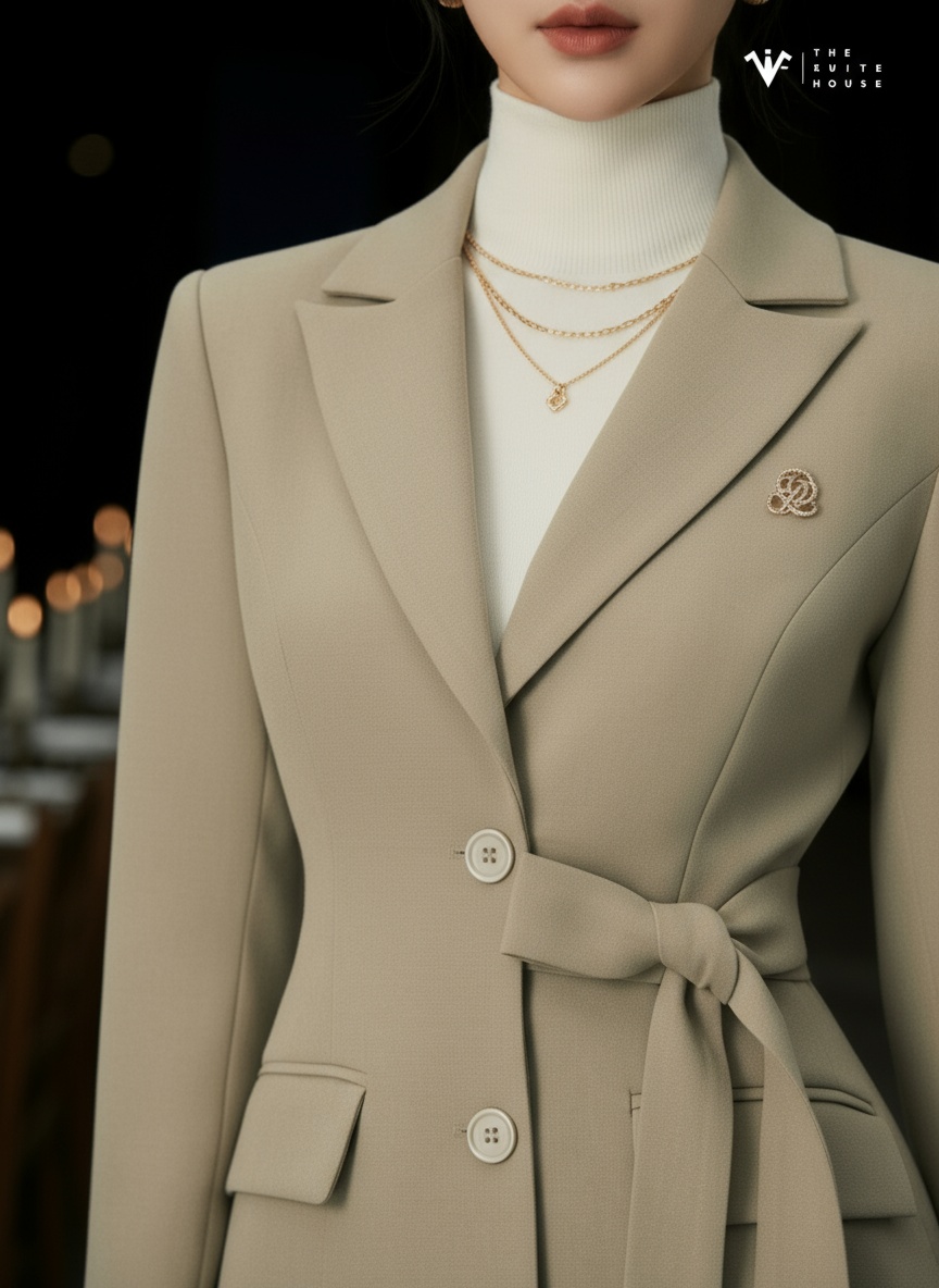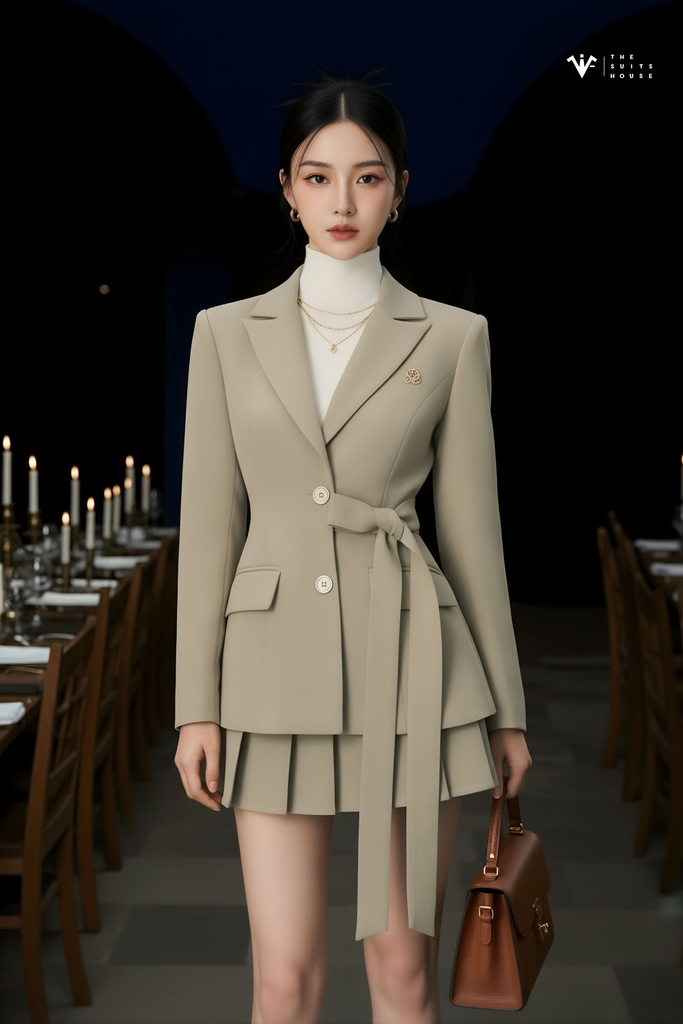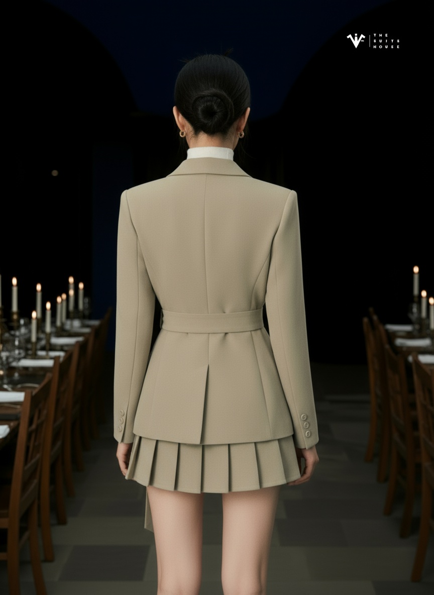 Bộ suit beige sáng gồm blazer thắt đai và chân váy xếp ly ngắn, được may đo trên nền wool blend cao cấp, mang lại phom dáng chuẩn xác nhưng vẫn mềm mại trong từng chuyển động. Blazer 2 khuy, chiết eo nhẹ tạo dáng đồng hồ cát tự nhiên, điểm nhấn nằm ở đai vải cùng tông giúp tôn vòng eo và mang lại nét nữ tính hiện đại.