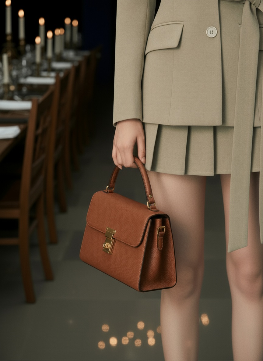 Phần váy xếp ly mini là điểm chạm phá cách – vừa thanh lịch, vừa trẻ trung, tôn lên đôi chân thon dài và mang lại năng lượng tươi mới. Tổng thể được cân bằng hoàn hảo khi kết hợp cùng áo cổ lọ trắng và túi da nâu cổ điển, tạo nên phong thái quý cô thành đạt nhưng vẫn đầy sức sống.