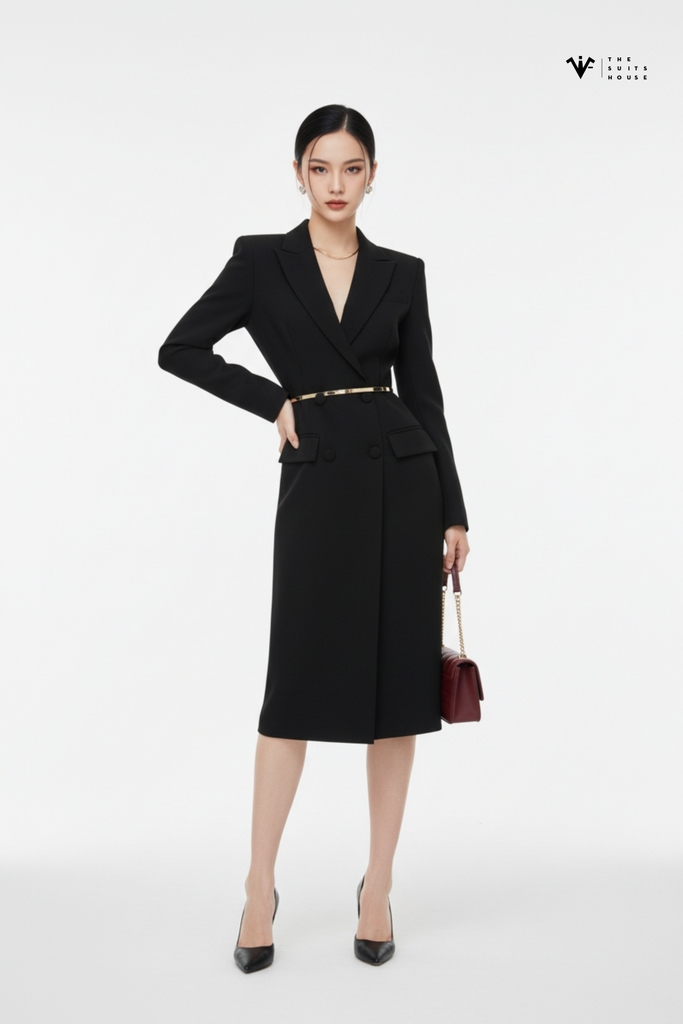 Sự kết hợp hoàn hảo giữa sức mạnh của quyền lực và vẻ đẹp thanh lịch, mẫu Black Double-Breasted Midi Blazer Dress là biểu tượng của phong thái doanh nhân nữ hiện đại – người dẫn dắt bằng sự tự tin, chứ không cần phô trương.