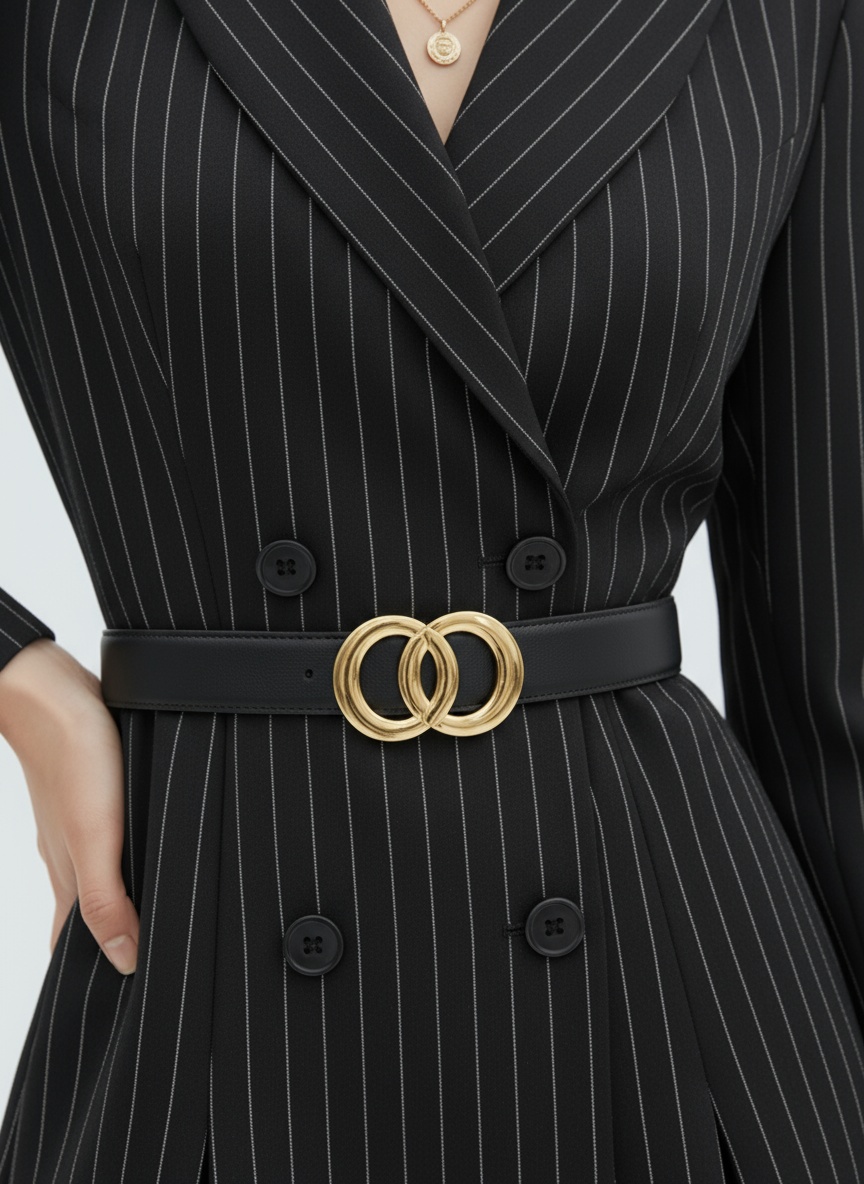 Phần thắt lưng da bản nhỏ khóa kim loại ánh vàng tạo điểm nhấn hoàn hảo, nhấn vào vòng eo và mang đến hình ảnh người phụ nữ kiểm soát – tự tin – đầy cuốn hút.