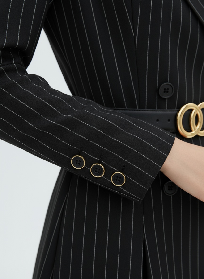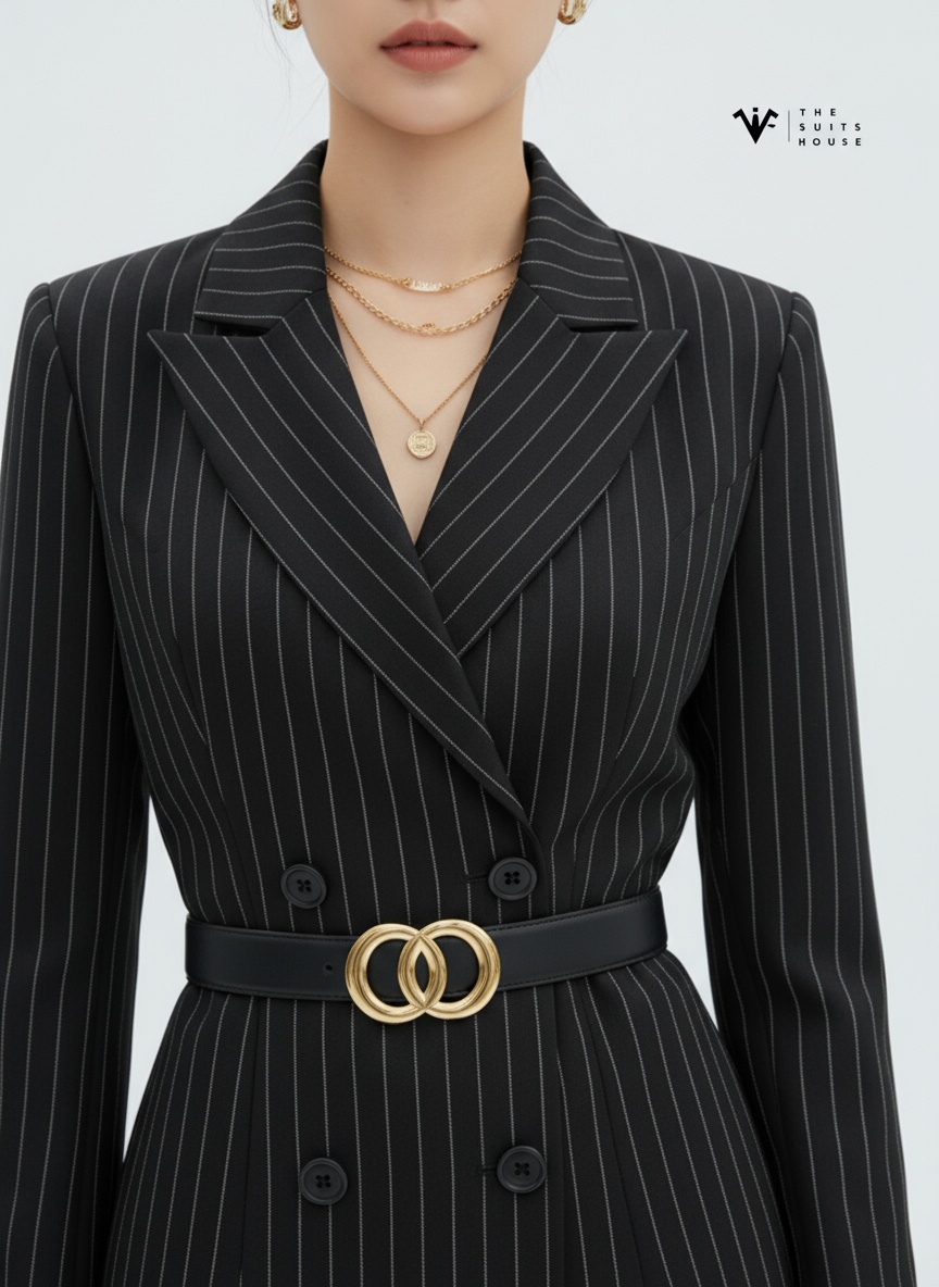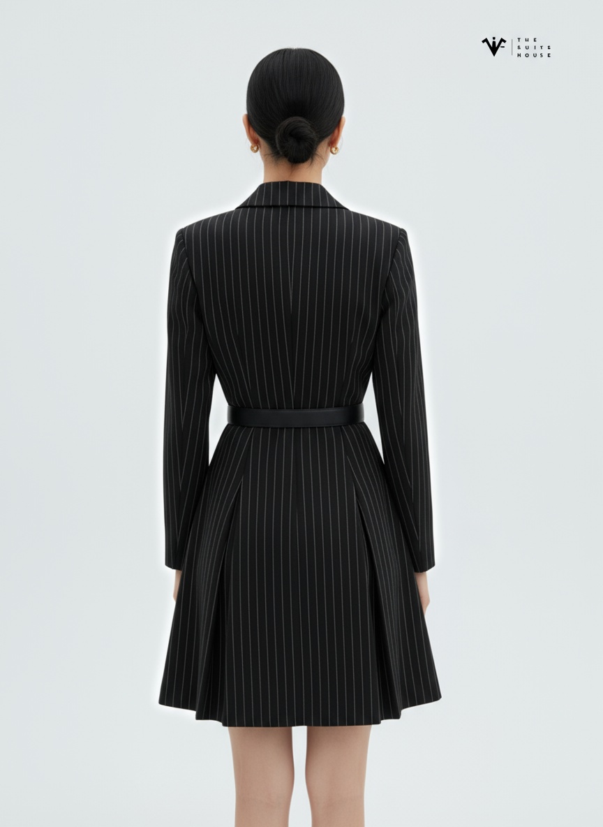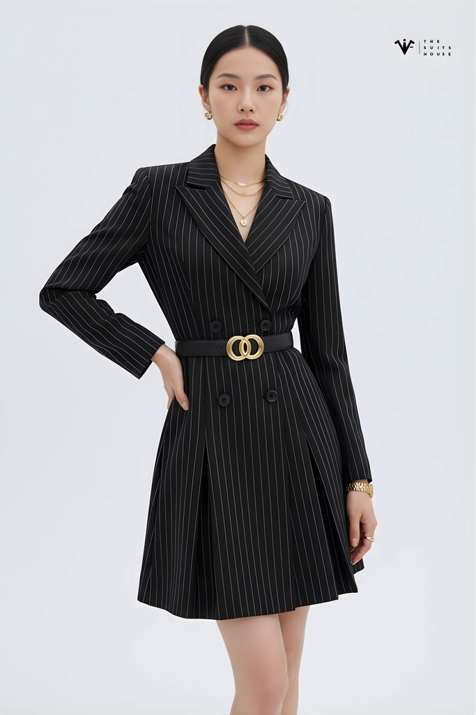 Chiếc đầm blazer đen kẻ sọc pinstripe được dựng phom chuẩn xác, với cấu trúc double-breasted tôn dáng và đường xếp ly nhẹ ở tà váy giúp tổng thể mềm mại mà vẫn sắc nét.