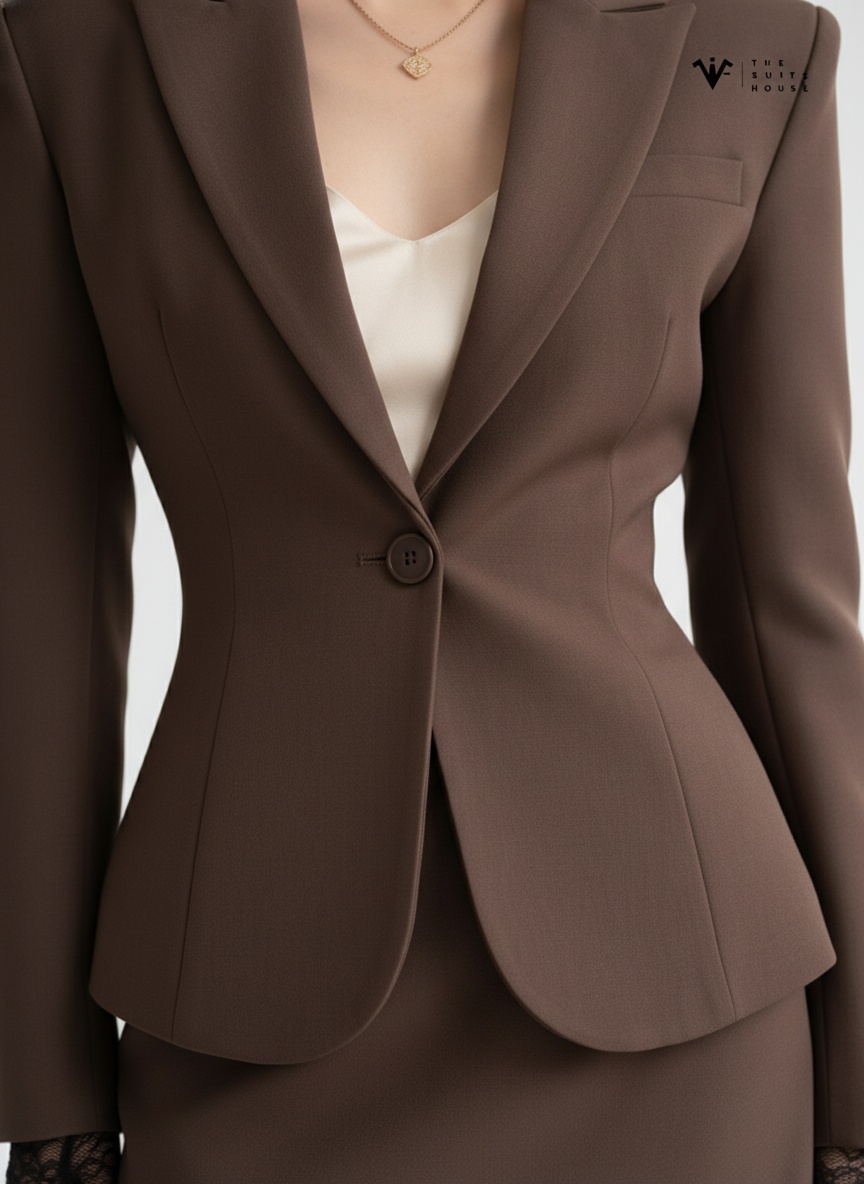 Bộ skirt suit tông nâu chocolate mang đậm dấu ấn của The Suits House: chuẩn phom, sắc nét và đầy tinh thần “đo ni đóng dáng”.