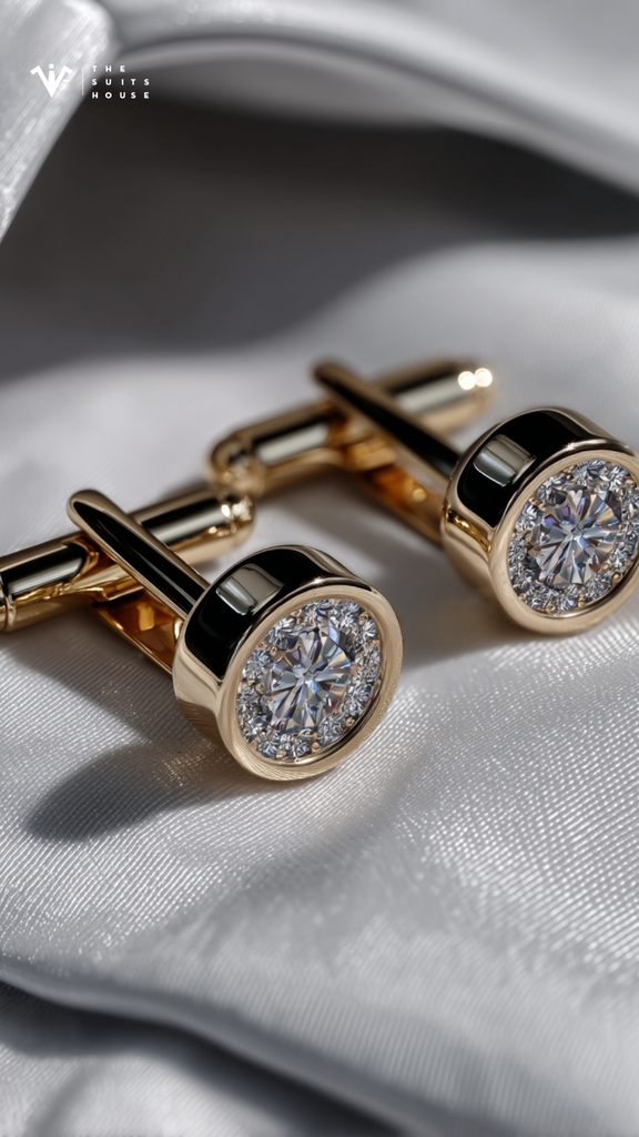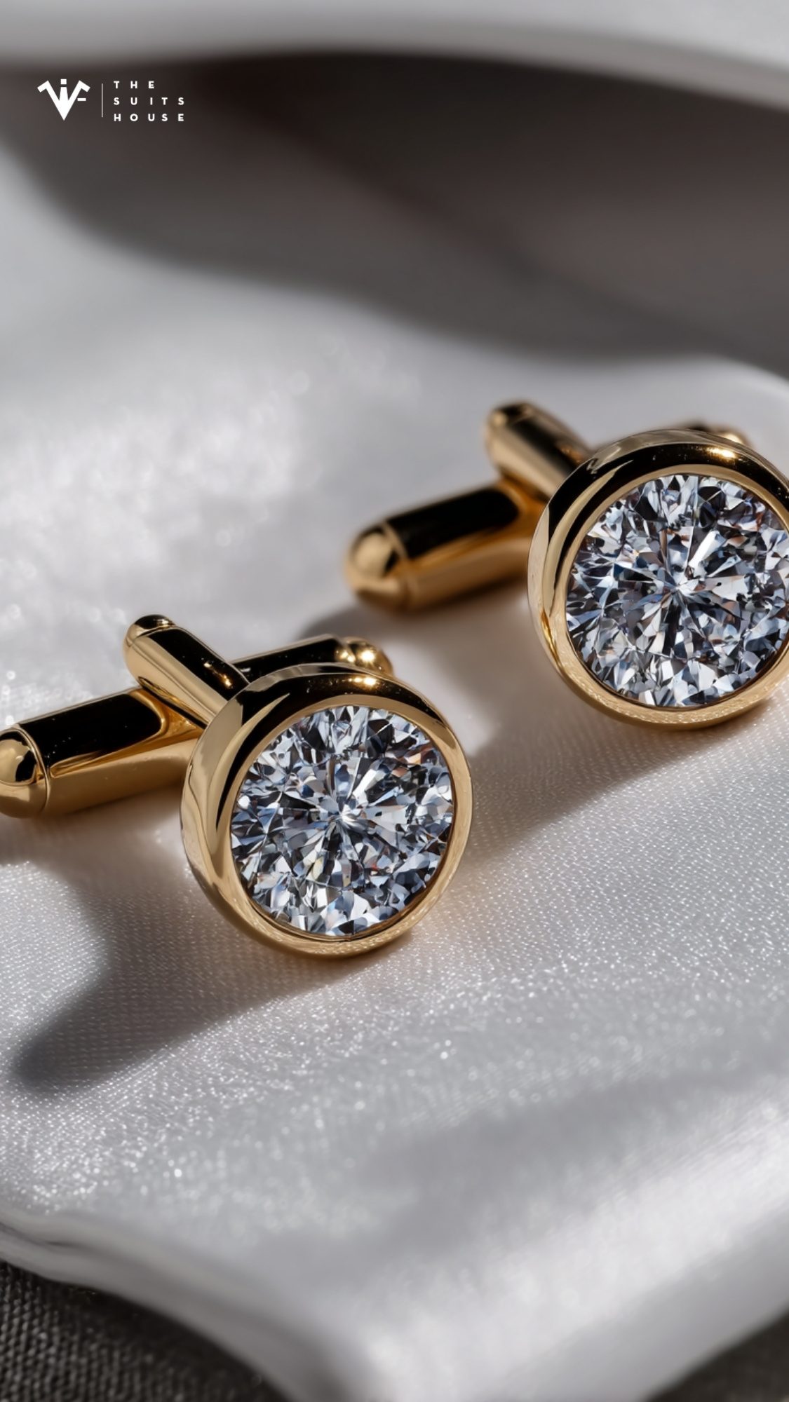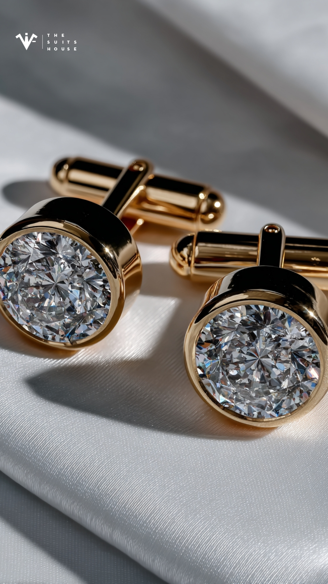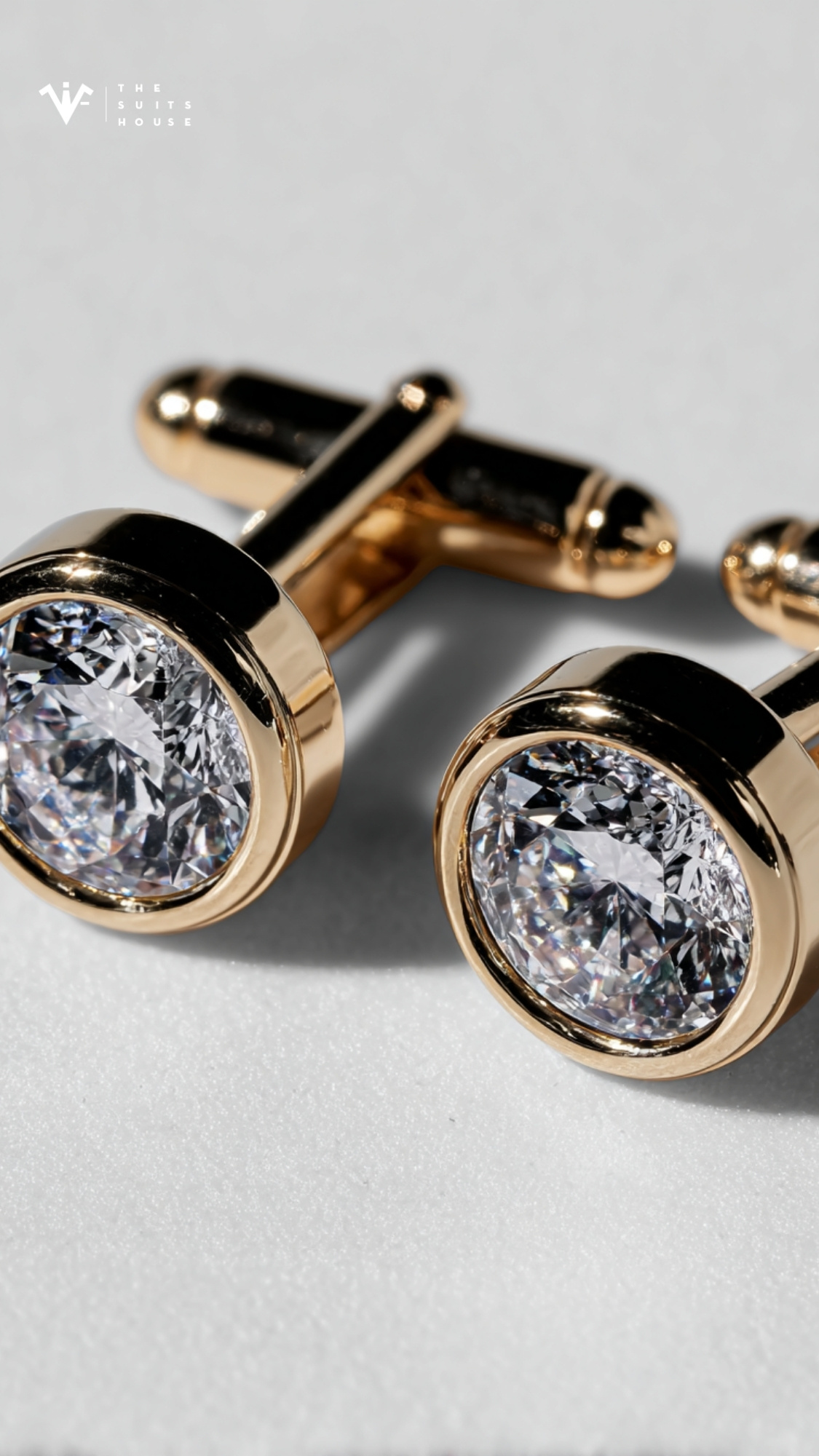 Cặp cufflinks mạ vàng cao cấp đính đá Swarovski được chế tác tỉ mỉ, phản chiếu ánh sáng qua từng giác cắt tinh tế.
