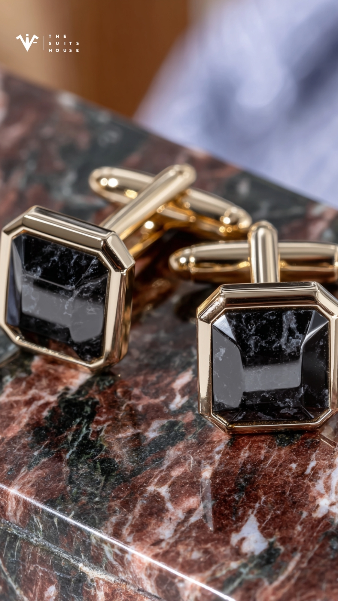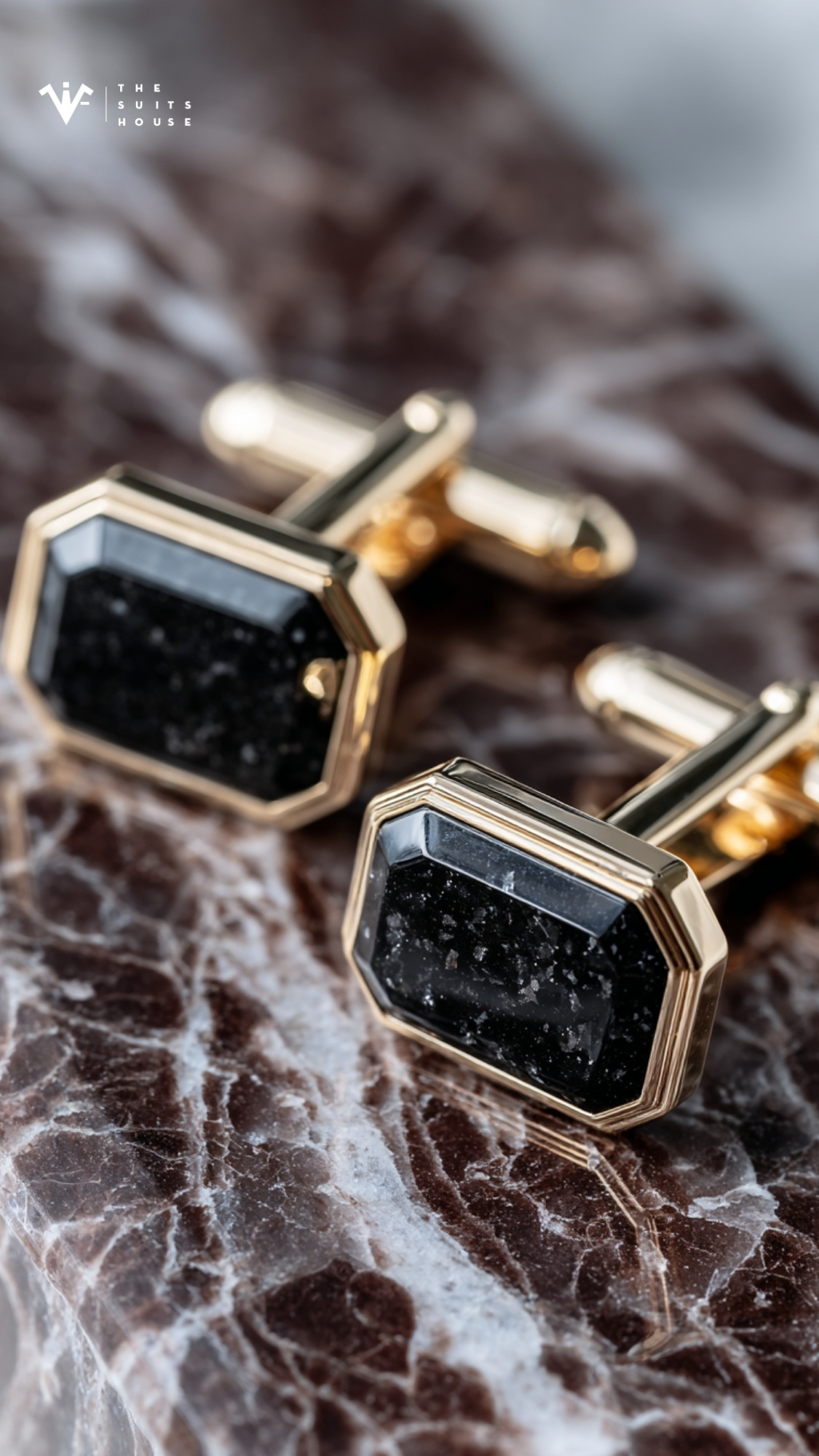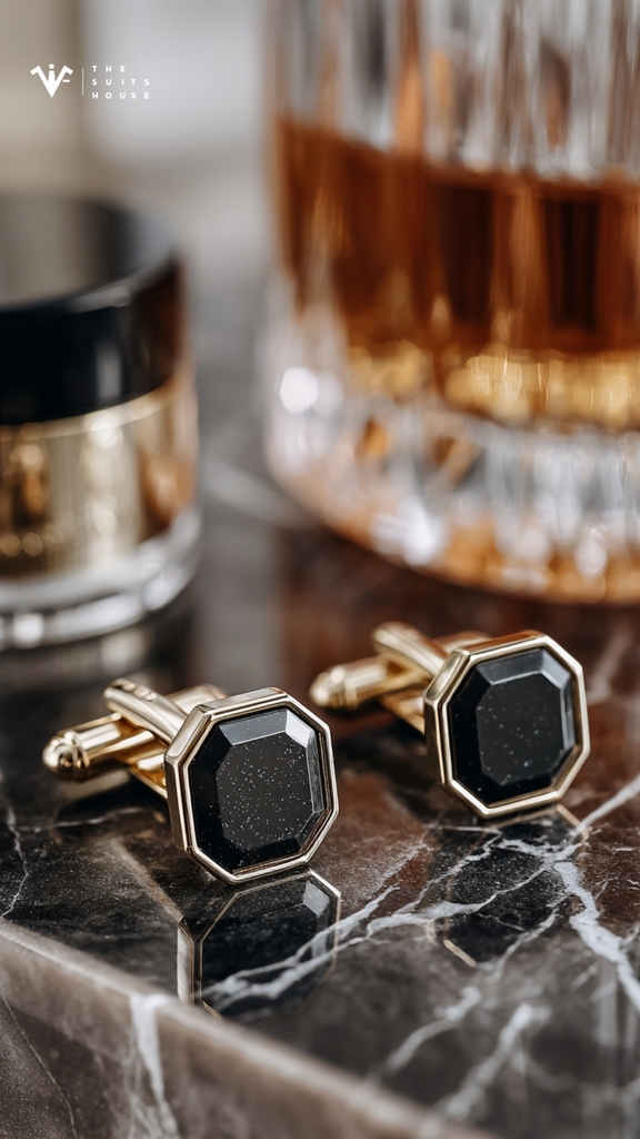 Cặp cufflinks mạ vàng viền đá đen ánh kim tuyến gợi cảm giác như bầu trời đêm – trầm tĩnh nhưng rực rỡ trong ánh sáng tinh tế.