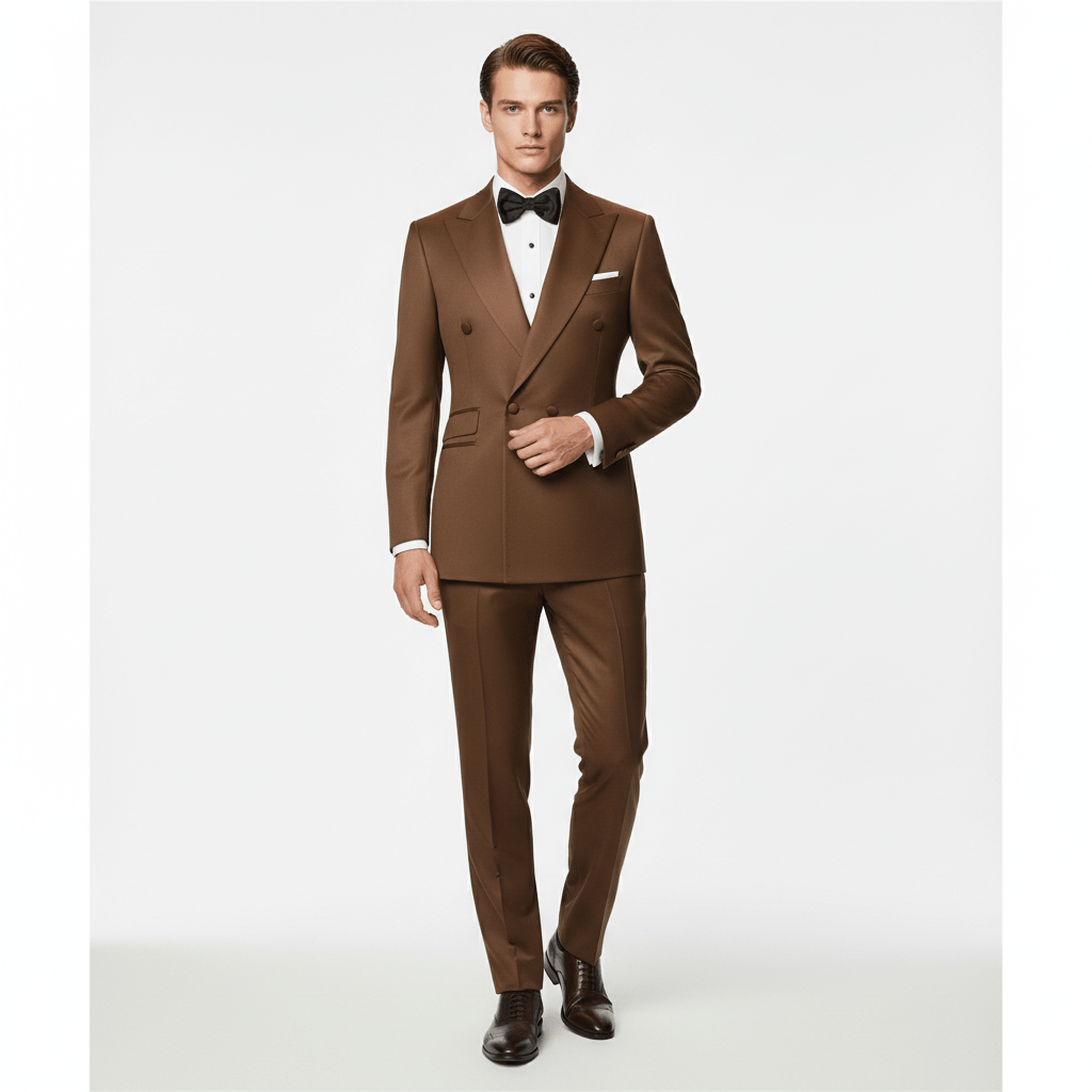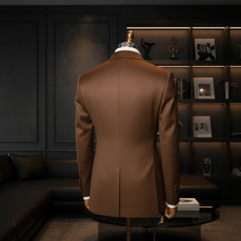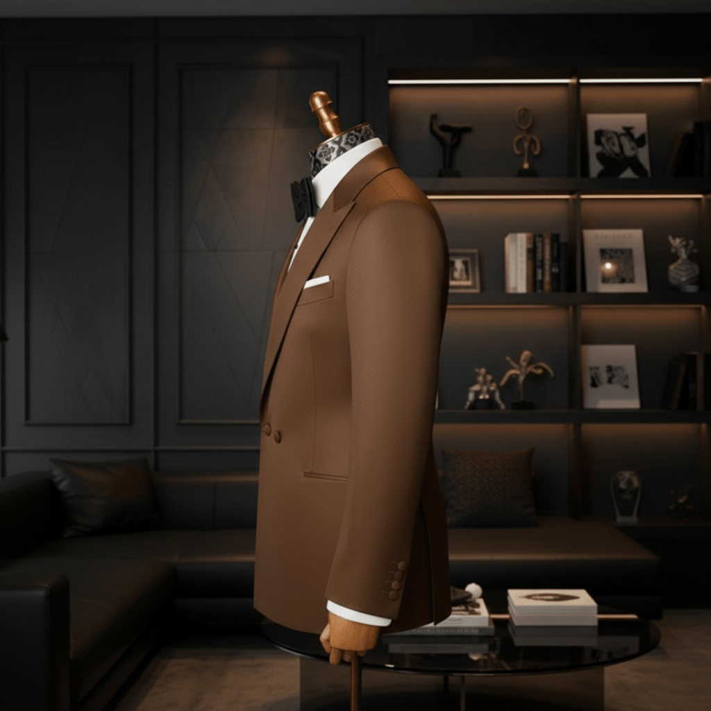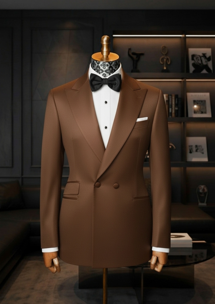 Sắc nâu cigar trầm ấm, kết hợp cùng thiết kế double-breasted cổ điển, tạo nên diện mạo vừa phong độ, vừa sang trọng, gợi nhớ tinh thần của những quý ông châu Âu cổ điển nhưng được làm mới trong form dáng modern fit ôm nhẹ, tôn dáng Việt.