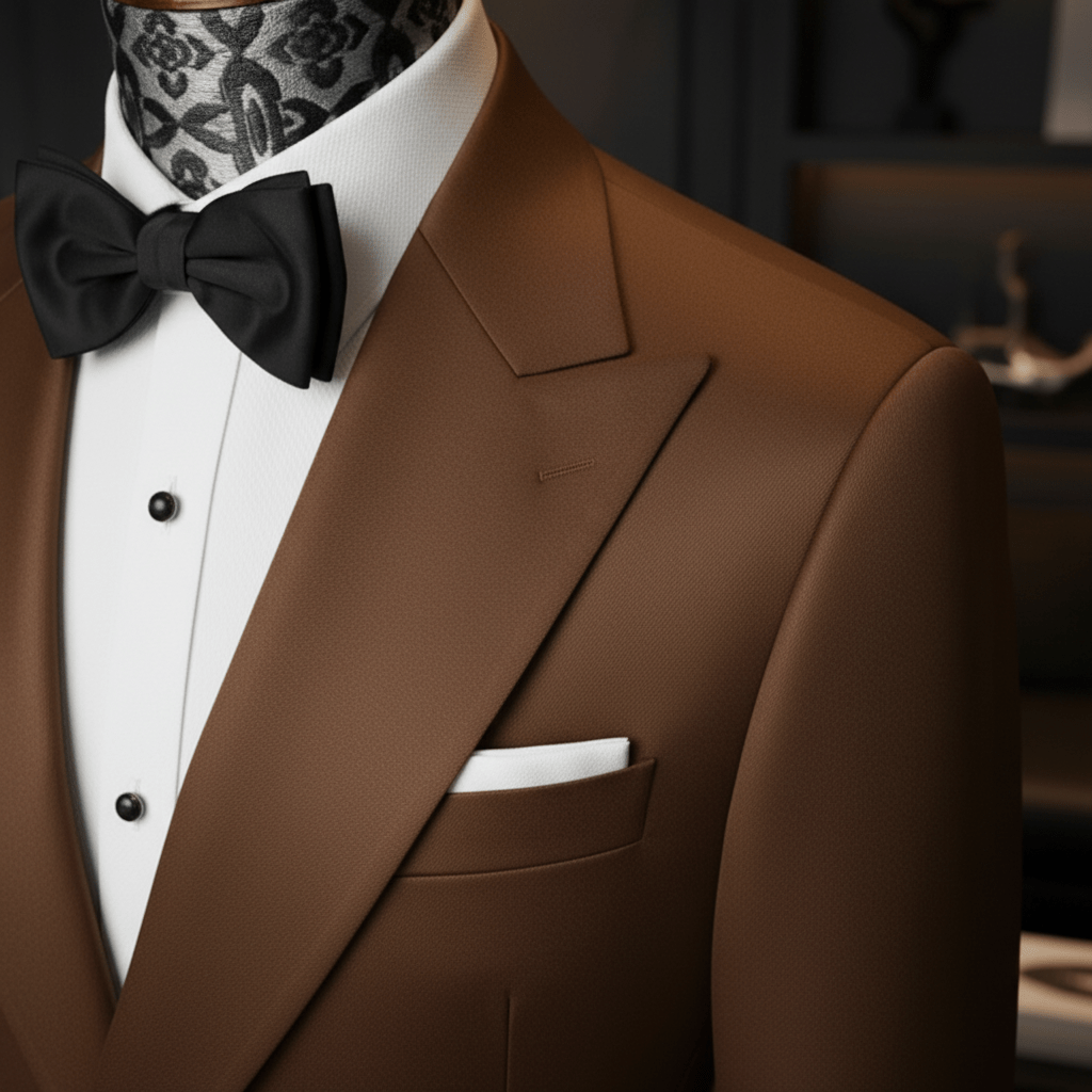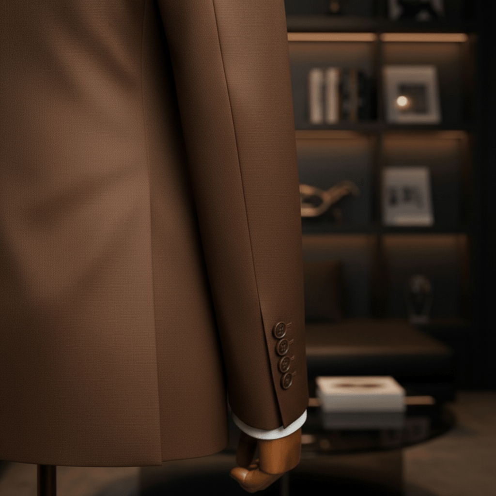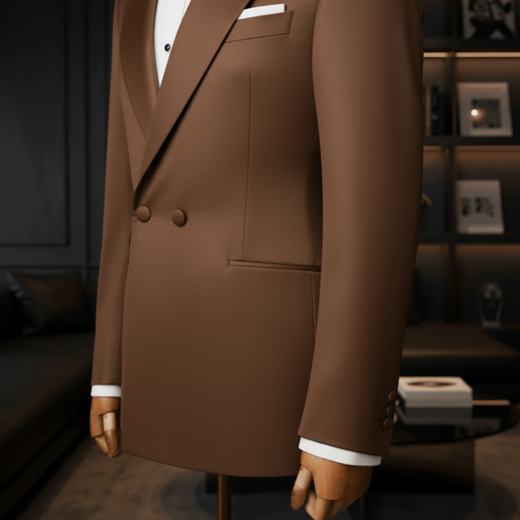 Sắc nâu cigar trầm ấm, kết hợp cùng thiết kế double-breasted cổ điển, tạo nên diện mạo vừa phong độ, vừa sang trọng, gợi nhớ tinh thần của những quý ông châu Âu cổ điển nhưng được làm mới trong form dáng modern fit ôm nhẹ, tôn dáng Việt.
