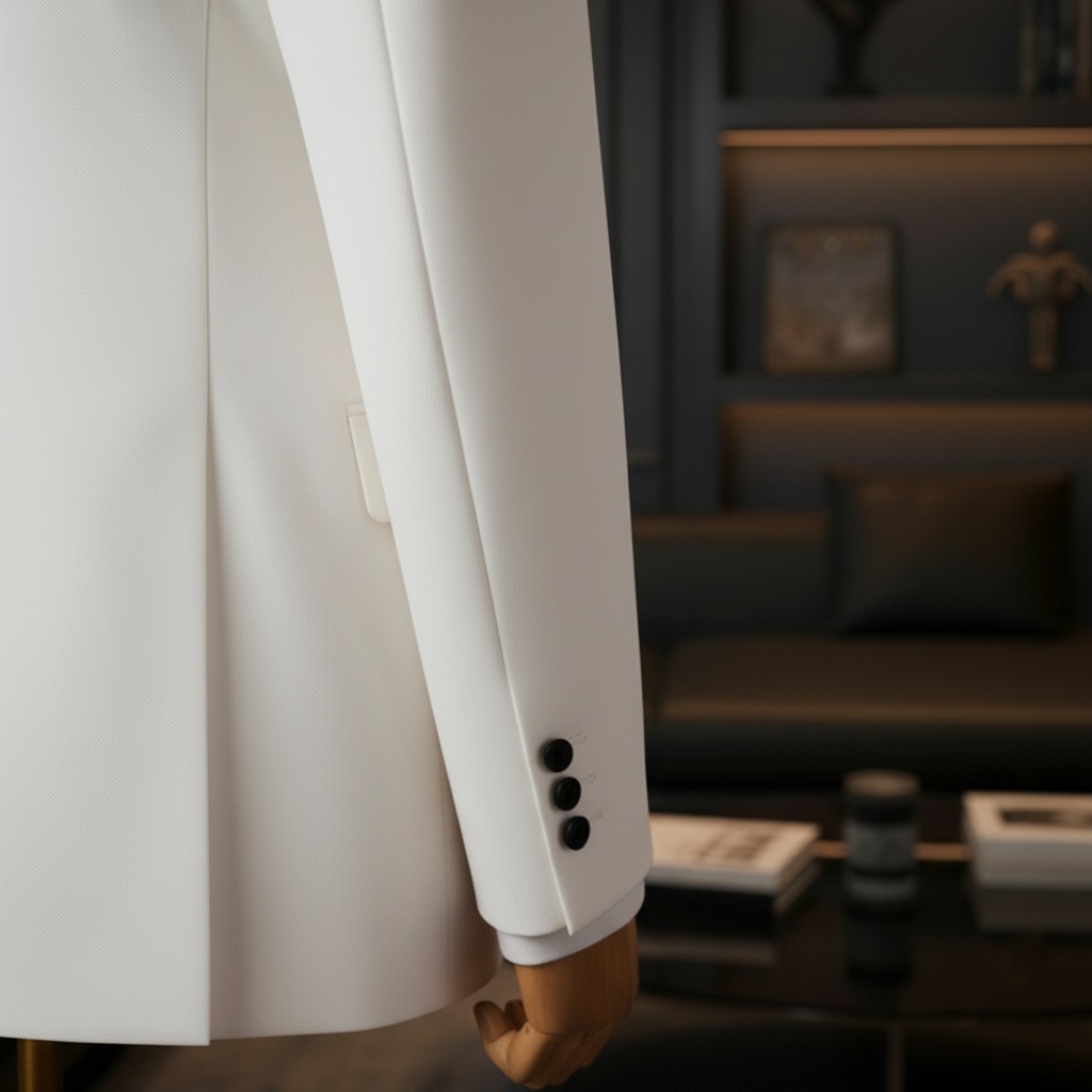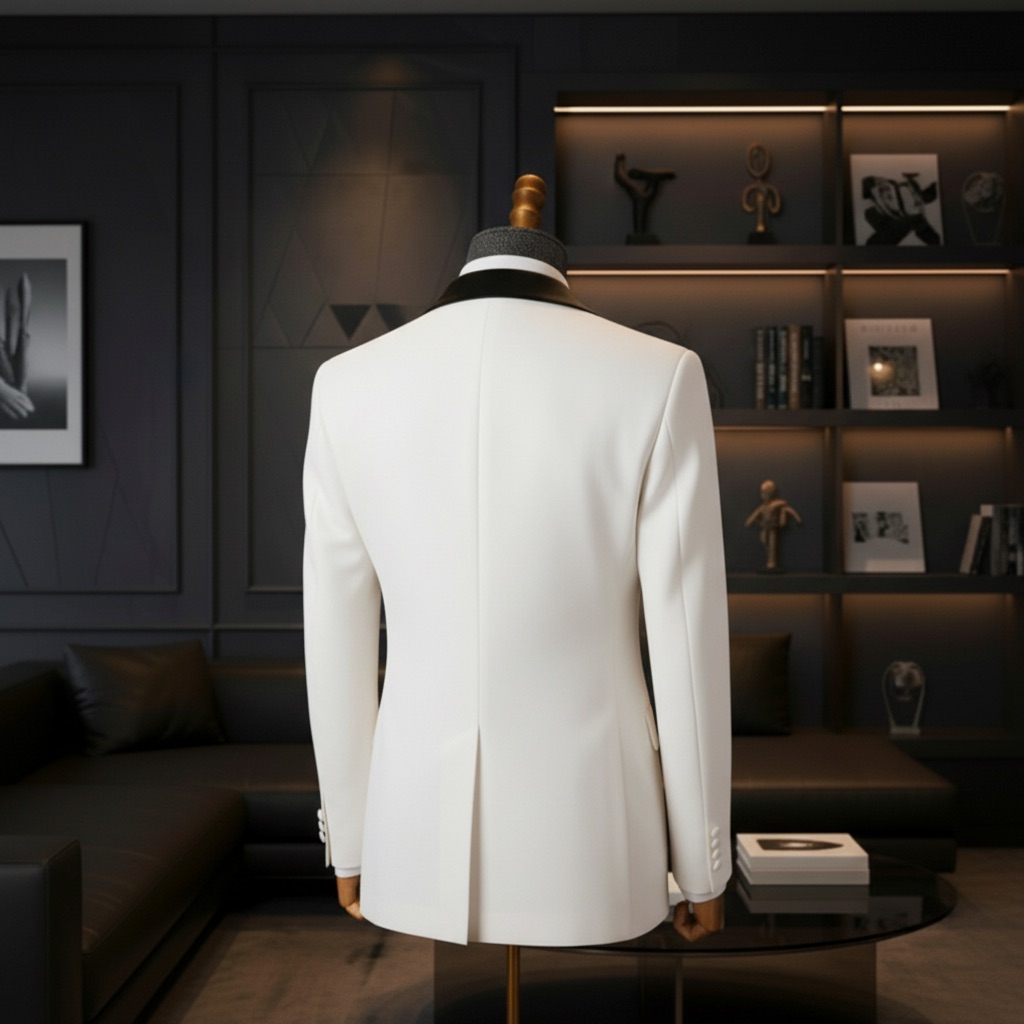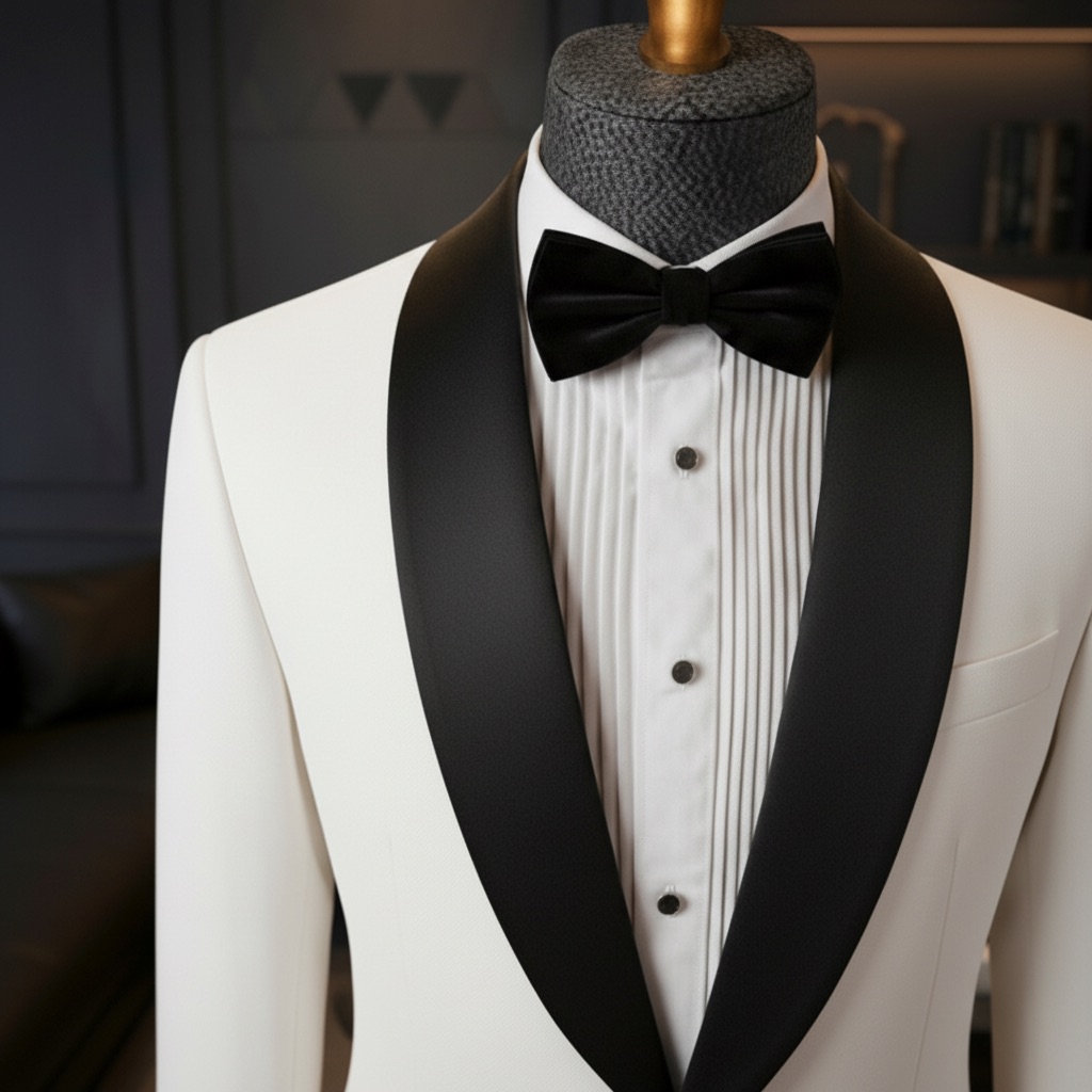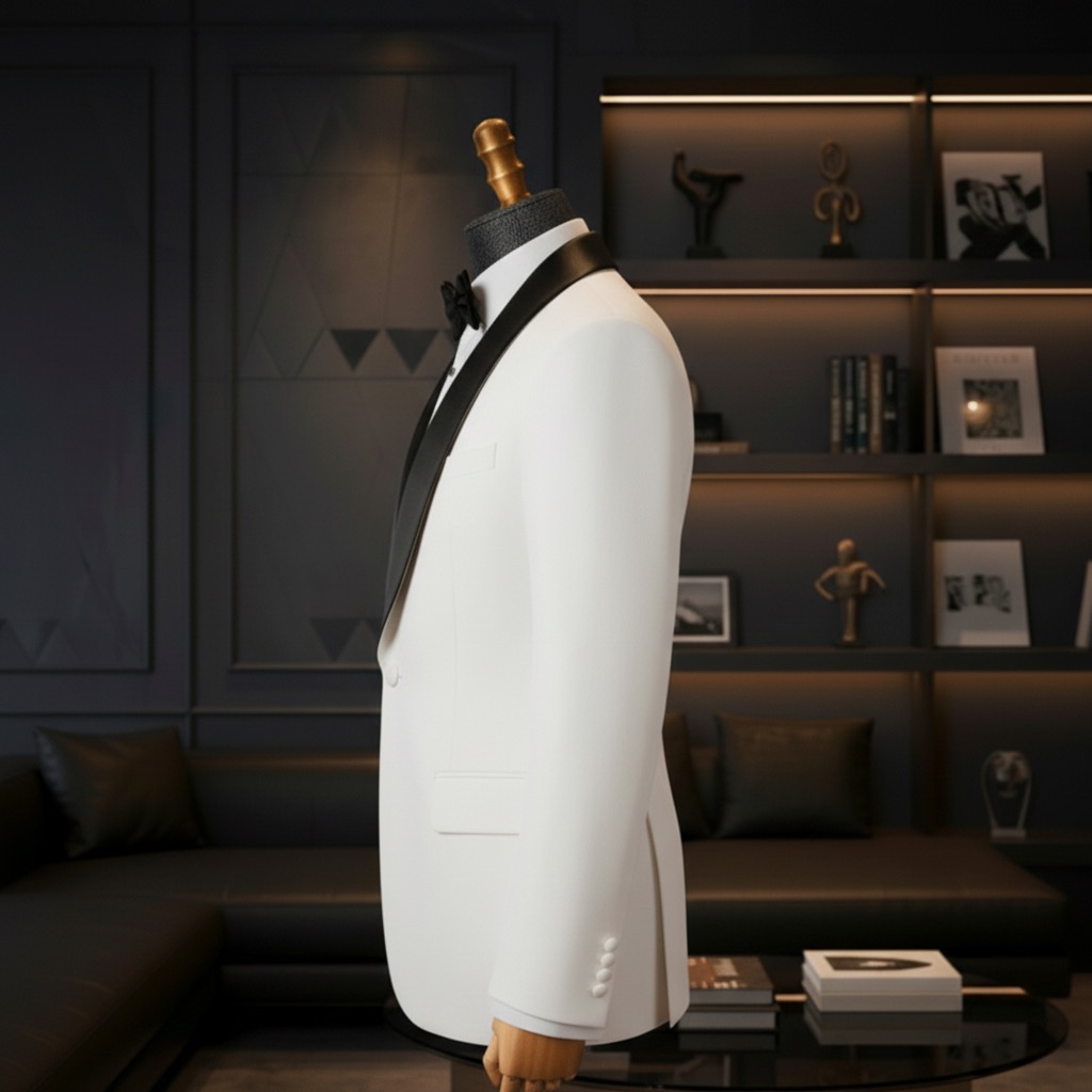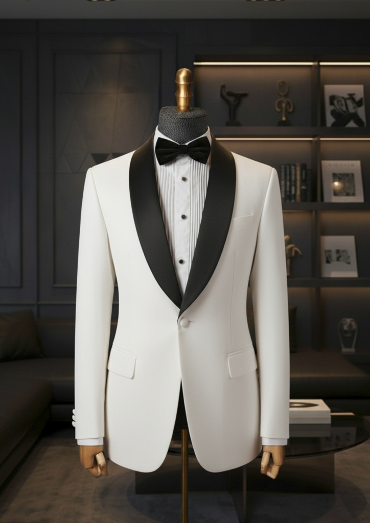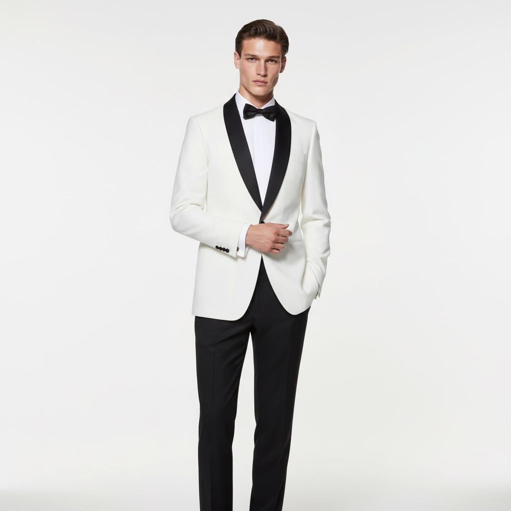Với sự kết hợp táo bạo giữa sắc trắng tinh khôi của thân áo và ve áo Lapel Shawl (ve cổ tròn) màu đen huyền bí, chiếc tuxedo này toát lên khí chất lịch lãm và quyến rũ khó cưỡng.