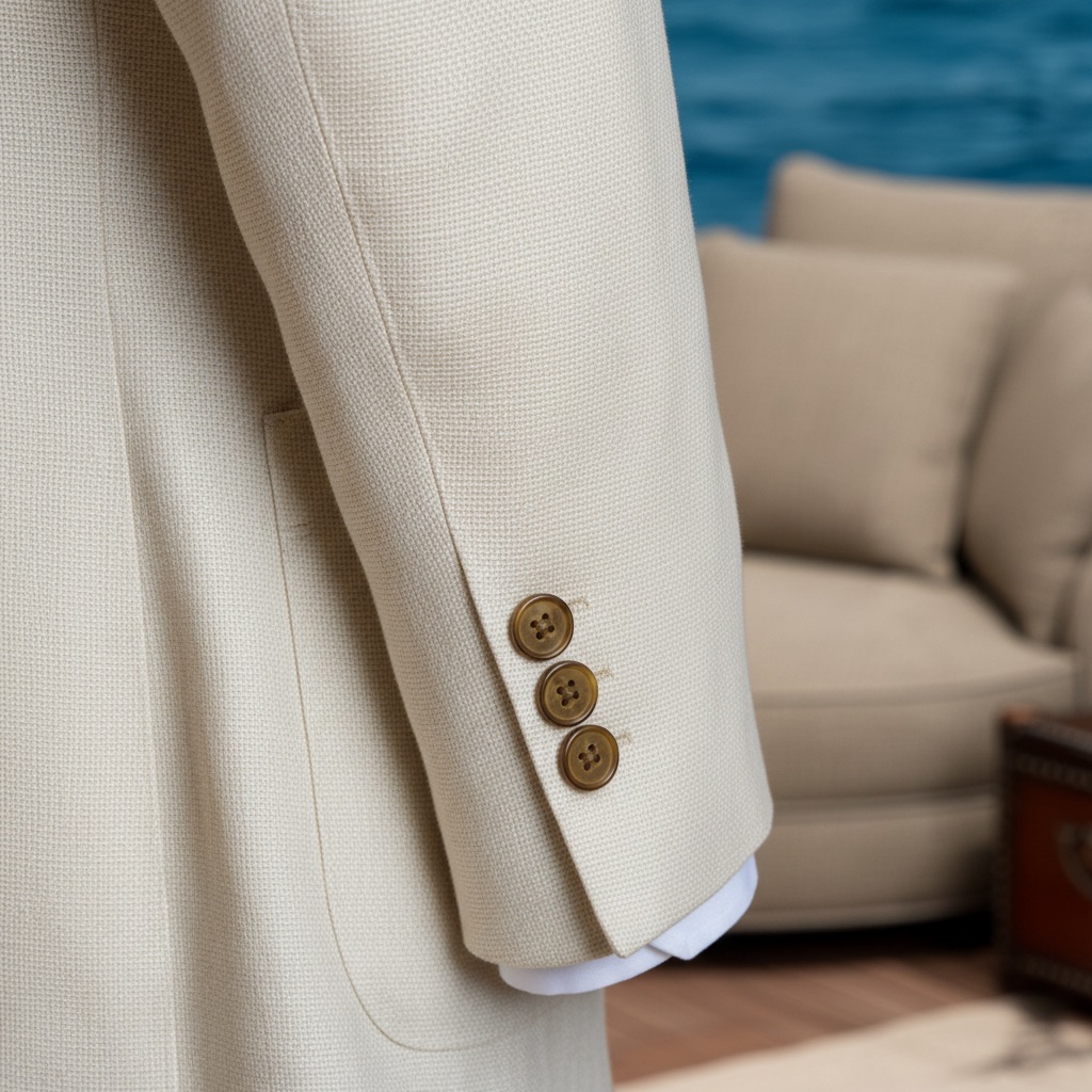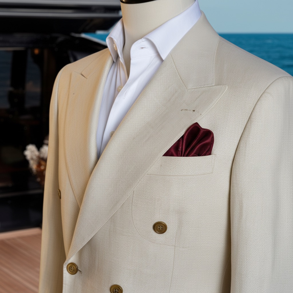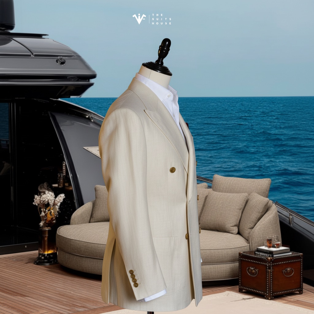 Imperial Riviera là biểu tượng của sự quyền lực và thanh lịch, được thiết kế dành riêng cho những quý ông theo đuổi phong cách sống đẳng cấp. Chiếc blazer màu kem với thiết kế double-breasted cổ điển, ve áo kiểu peak lapel và sáu nút vàng ánh kim tạo nên một tổng thể đầy uy nghi và sang trọng.