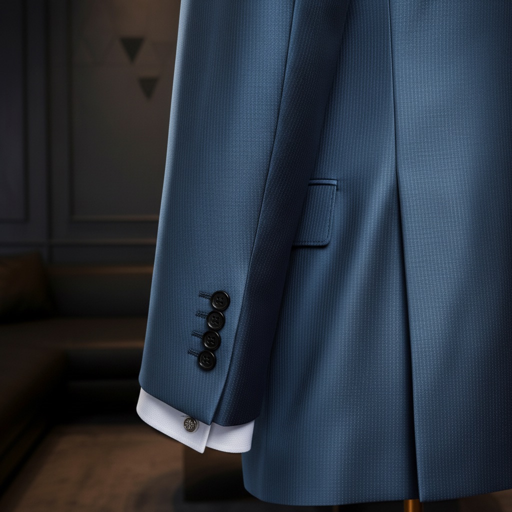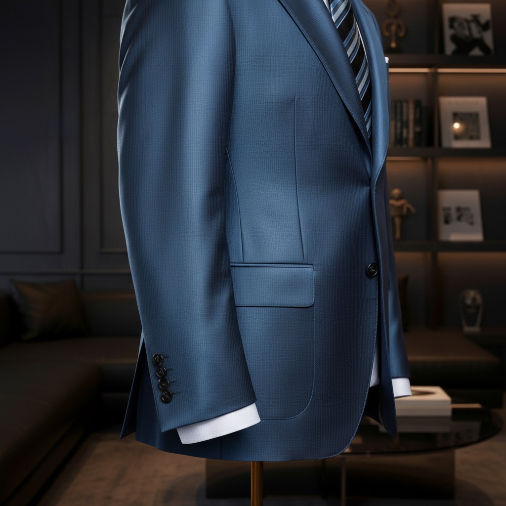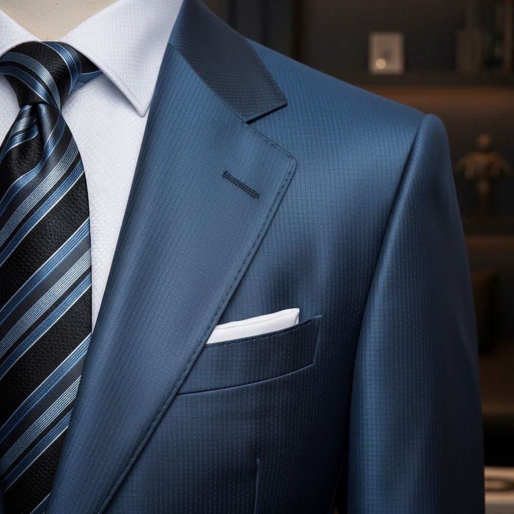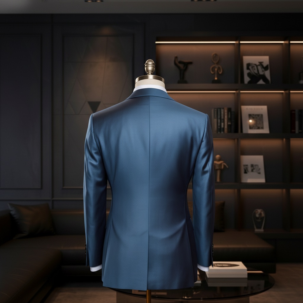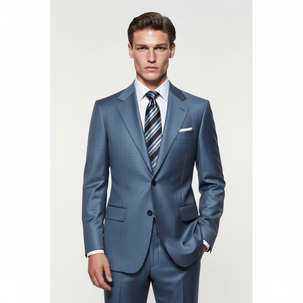 Một dấu ấn của sự lịch lãm hiện đại, bộ suit Sapphire Peak Lapel mang sắc xanh sapphire ánh satin tinh tế, phản chiếu ánh sáng nhẹ nhàng như bề mặt của viên đá quý dưới ánh đèn.