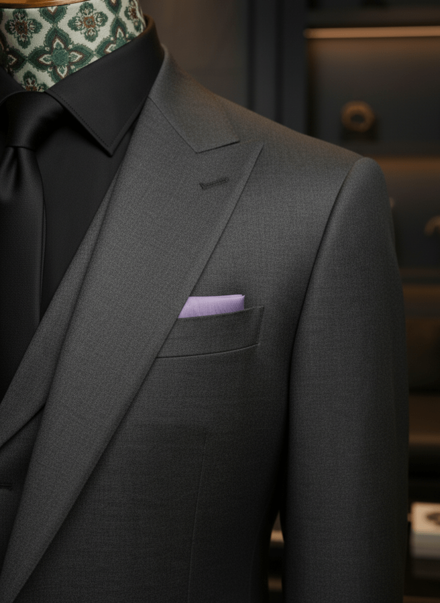 Cách phối hoàn hảo giữa sơ mi đen, cà vạt đồng tông và điểm nhấn khăn túi tím nhạt thể hiện gu thẩm mỹ tinh tế nhưng không phô trương.