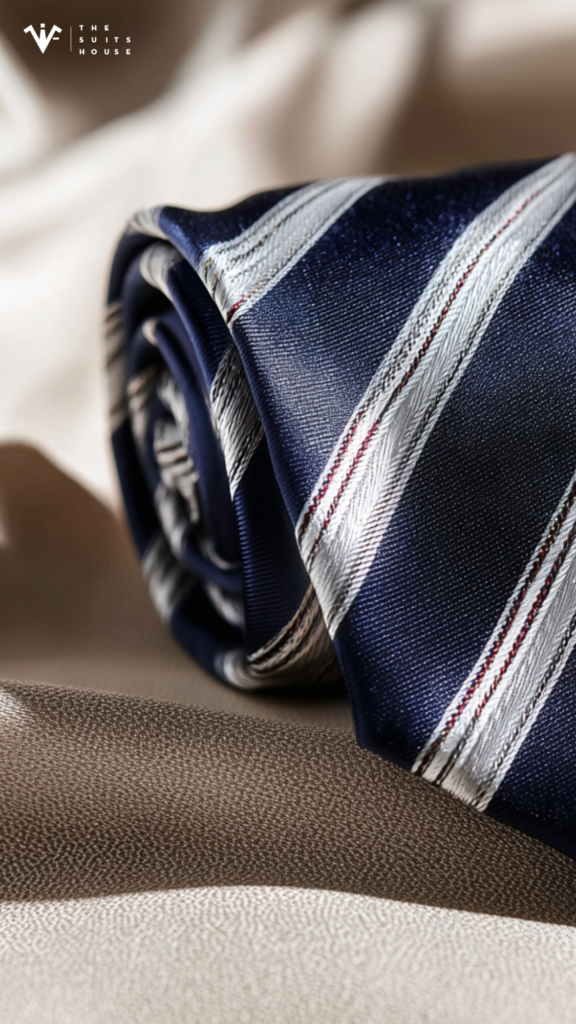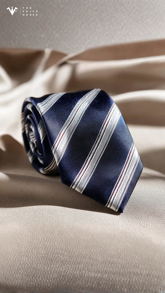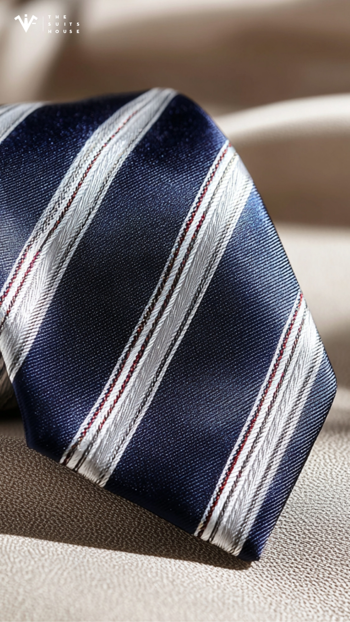 Cà vạt Oxford Striped mang tinh thần của quý ông doanh nhân cổ điển, kết hợp giữa sự chỉn chu Anh quốc và phong thái hiện đại. Được dệt từ lụa satin cao cấp, họa tiết sọc chéo bạc xen đỏ bordo trên nền xanh navy sâu tạo nên hiệu ứng ánh sáng sang trọng và nổi bật.