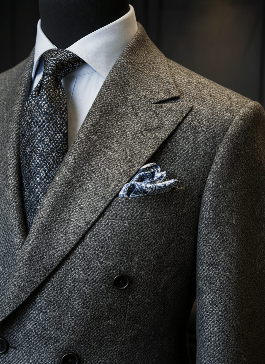 Điểm nhấn nằm ở caravat họa tiết woven đen-bạc cùng khăn cài túi xanh navy, tạo nên tổng thể hài hòa, sâu sắc và đầy quyền uy.