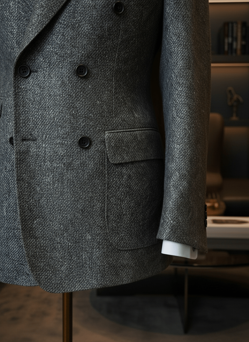 Thiết kế double-breasted cổ điển được tinh chỉnh theo tỉ lệ vàng, kết hợp cùng form ôm vừa vặn và cấu trúc vai chắc khỏe, tôn lên thần thái tự tin, quyết đoán và lịch lãm. Chất liệu wool pha cashmere Ý cao cấp mang đến độ mềm mịn và bề mặt ánh nhẹ sang trọng, biểu trưng cho sự đẳng cấp không phô trương nhưng luôn nổi bật.