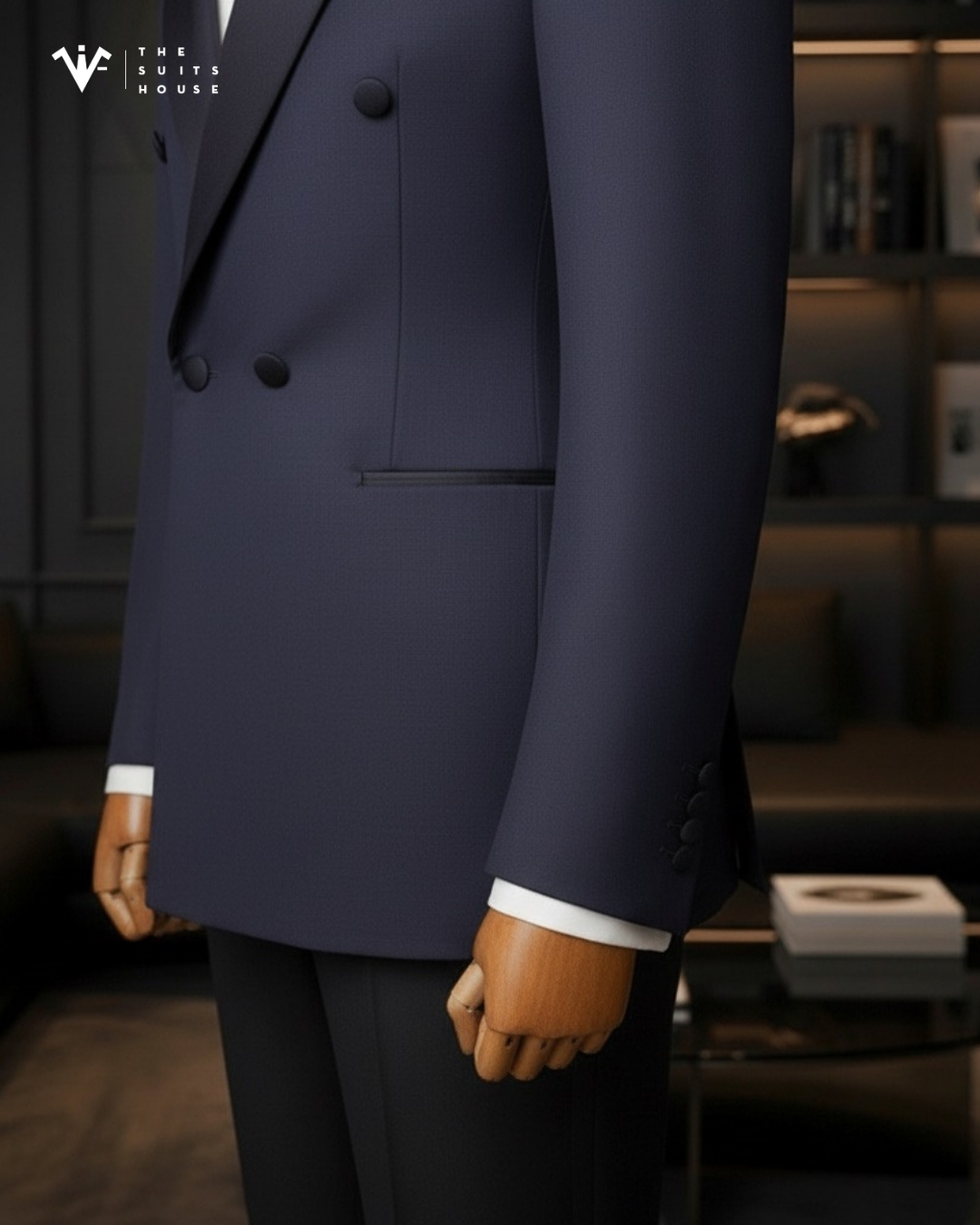 Sức mạnh của bộ Tuxedo Hai Hàng Khuy nằm ở cấu trúc uy nghiêm của nó. Thiết kế Double Breasted (Hai hàng khuy) tạo nên dáng vẻ vững chãi, uy quyền và đĩnh đạc. Chi tiết Ve Áo Peak Lapel (Ve Nhọn) bọc Satin đen bóng không chỉ tạo sự tương phản kinh điển mà còn mở rộng bờ vai, khẳng định phong thái lãnh đạo và sự sắc sảo của người mặc.